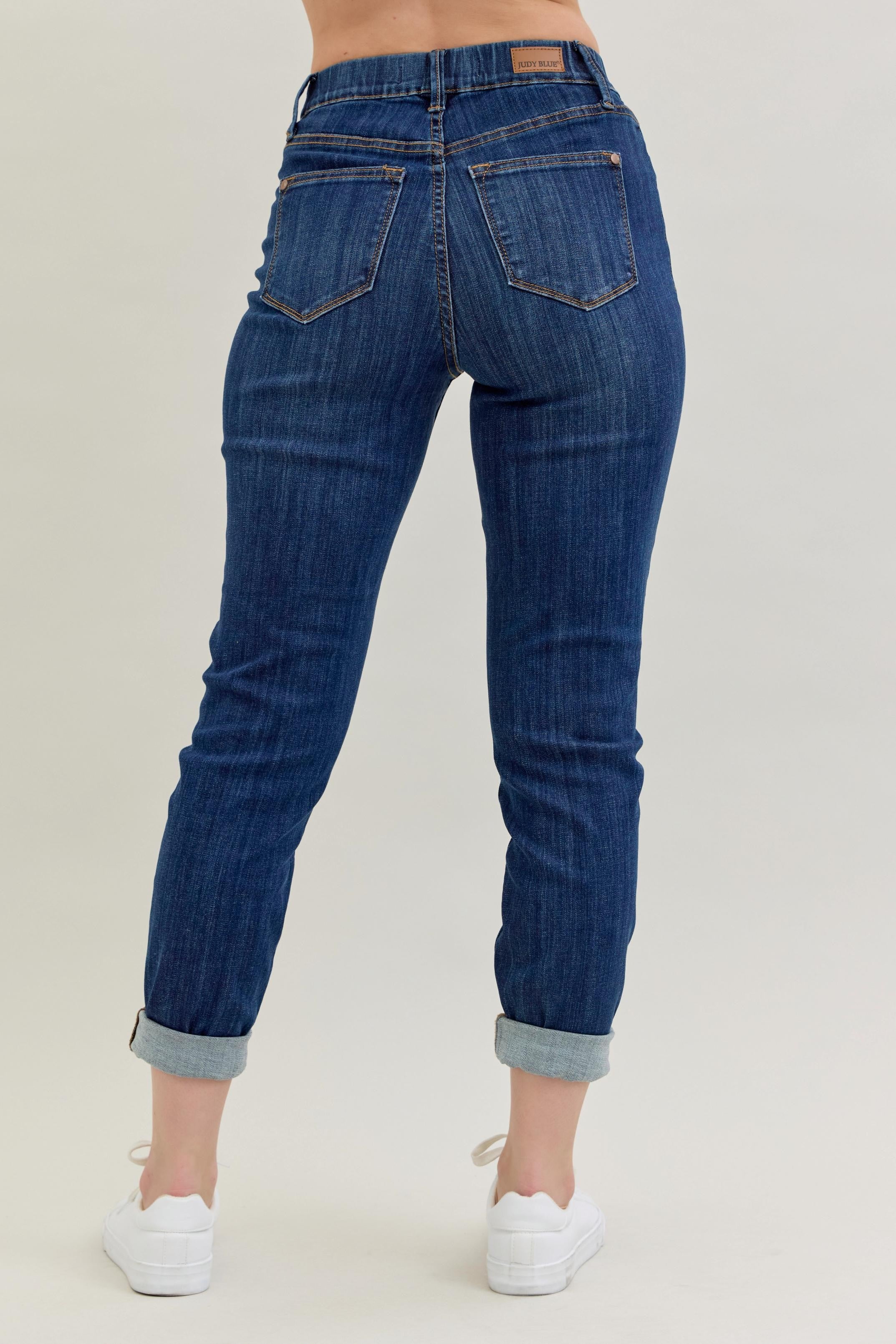 The Judy Blue High Waist Pull-On Double Cuff Slim jeans combine everyday comfort with a polished, put-together look. Made from a premium blend of 52.2% cotton, 21.5% rayon, 23.4% polyester, and 2.9% Lycra, they offer exceptional stretch, softness, and recovery for all-day wear. The high-rise fit, with a 10.75" rise, provides a flattering silhouette and comfortable coverage, while the pull-on waistband ensures a smooth, no-fuss style—perfect for pairing with fitted tops or flowy layers. The dark wash adds a sleek, versatile finish that transitions seamlessly from casual to dressy. A slim-leg cut keeps the look modern and streamlined, while the double cuff detail adds a touch of relaxed charm. Wear them cuffed with a 29" inseam for a laid-back vibe, or uncuff them to a 32" inseam for a longer, classic look. Easy to style and effortless to wear, these jeans are the perfect blend of comfort, versatility, and chic style for year-round outfits.