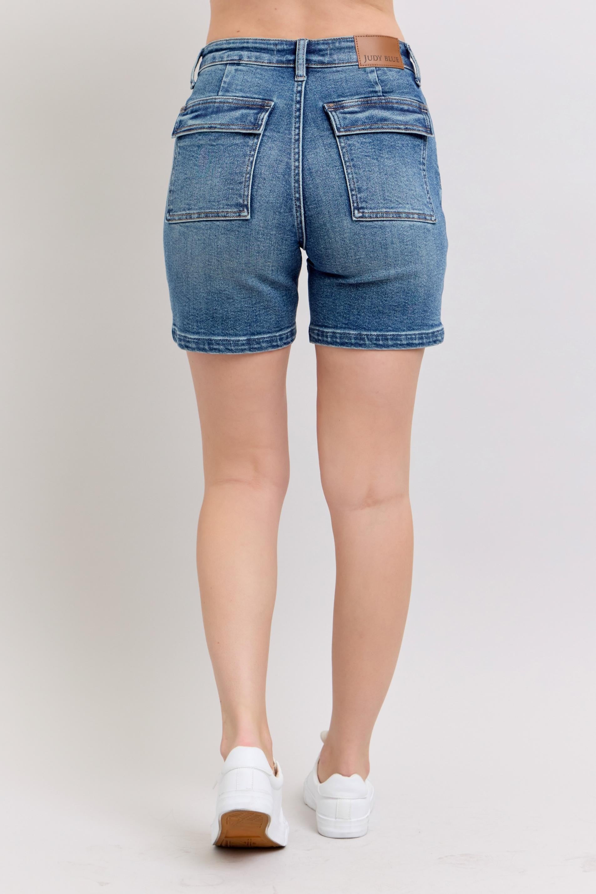 The Judy Blue Utility Pockets Mid Length Shorts in Medium Wash are a stylish blend of function and comfort. Designed with a flattering 11" high rise and a 6" inseam, these shorts offer just the right amount of coverage while maintaining a laid-back, casual vibe.
