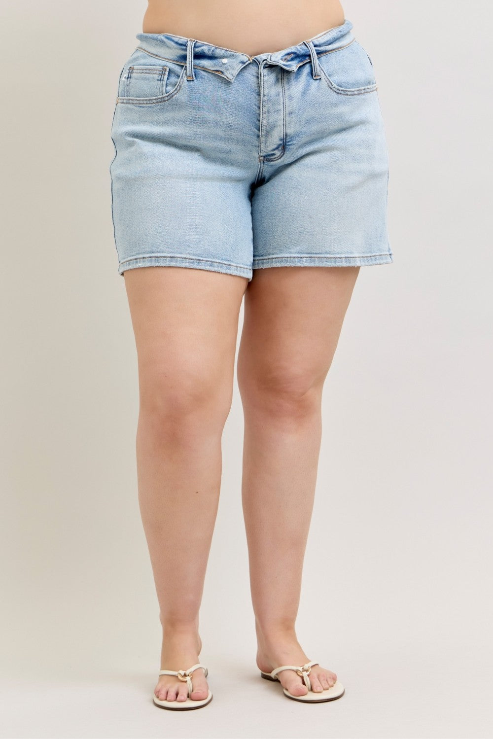 Curvy Foldover Waistband HW Slim Short. These light wash denim shorts are the perfect addition to your summer wardrobe. Designed for comfort and style, they feature a high-waisted fit that accentuates your curves and provides a flattering silhouette. The relaxed fit ensures all-day comfort, making them ideal for everyday wear or vacation outings. Crafted from lightweight and breathable denim, these shorts are perfect for warm weather. The unique waistband design adds a trendy touch, while the classic five-pocket styling offers practicality. Pair them with a simple tee and sandals for a casual look, or dress them up with a blouse and wedges for a night out. These versatile shorts are a must-have for any fashion-conscious woman looking for a stylish and comfortable option. FRONT RISE: 11" INSEAM:5" 94% Cotton, 5% Polyester, 1% Spandex