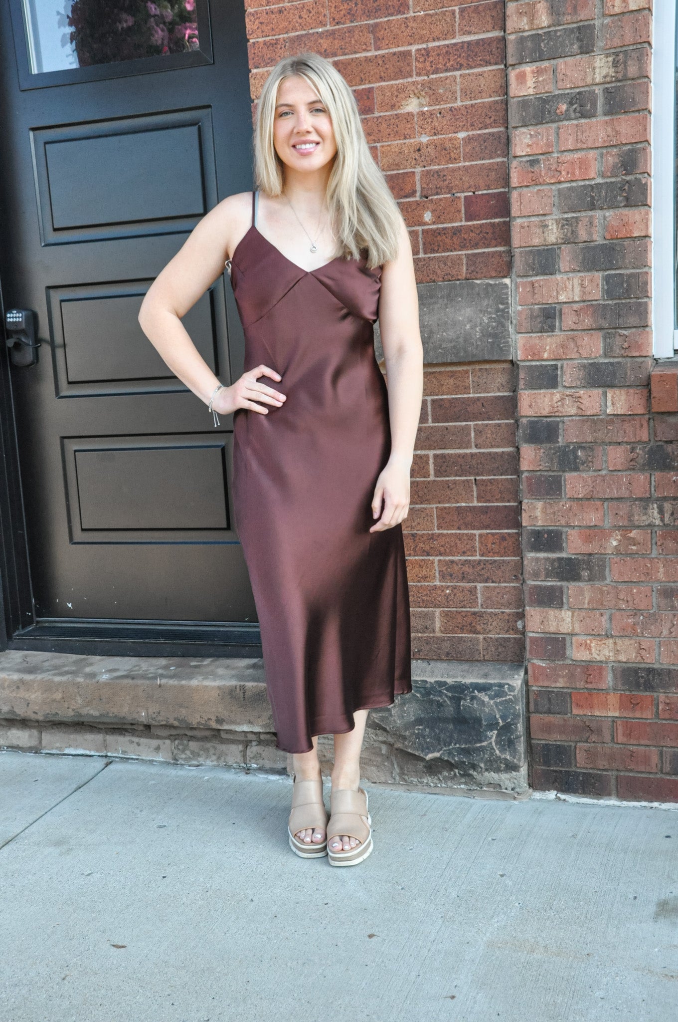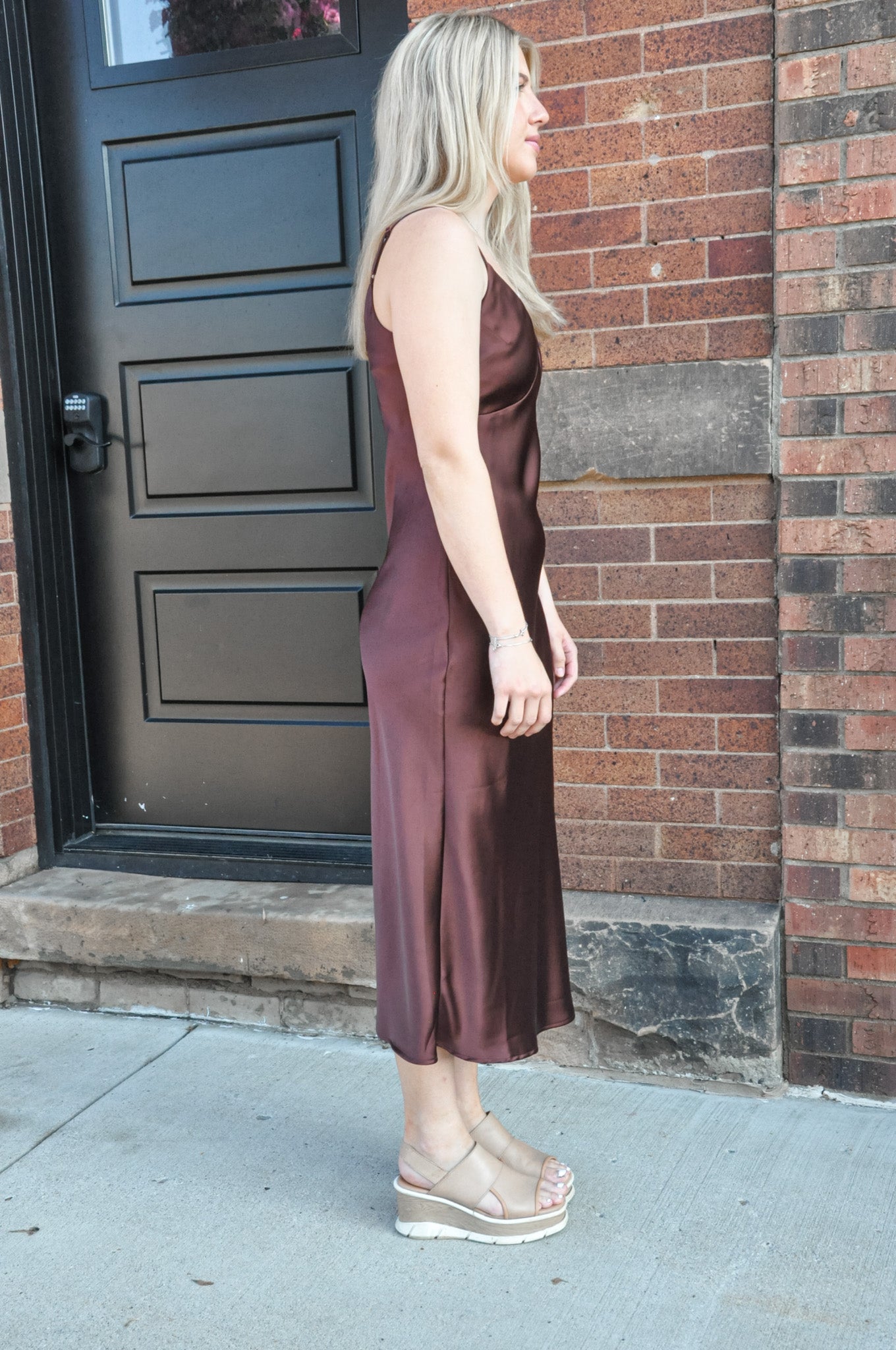 The Princess Treatment Satin Midi Dress in Chestnut is a stunning statement piece made to turn heads. Crafted from smooth, silky 100% polyester, this dress features a romantic V-neckline and adjustable shoulder straps for a personalized fit. The defined bust adds structure and shape, enhancing your natural curves, while the fitted bodice flows gracefully into a long, elegant midi-length skirt. A side slit adds a hint of allure and makes movement easy and effortless. The rich chestnut hue brings warmth and sophistication, making this dress ideal for fall weddings, date nights, holiday parties, or any occasion where you want to feel extra special. With its balance of elegance and comfort, the Princess Treatment Satin Midi Dress offers timeless charm and modern femininity. Just add heels and your favorite jewelry for an effortlessly chic look fit for royalty.