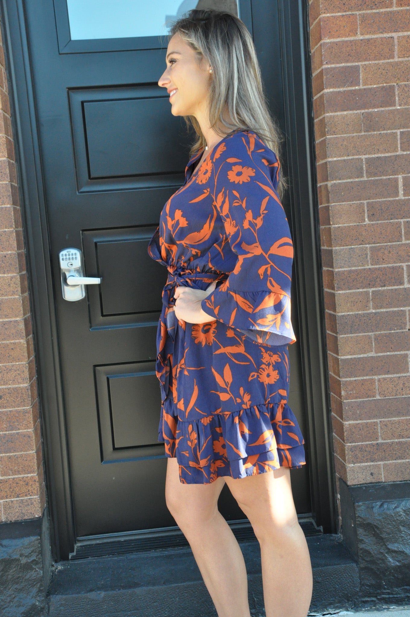 The Printed Wool Peach Surplus Dress in Midnight Blue and Martini Olive is a beautiful blend of elegance and comfort, ideal for various occasions. With its wrap V-neckline and hidden snap button, it offers a secure yet stylish look, while the adjustable ribbon closure on the waist allows for a custom fit. The floral print and ruffled detailing on the hem and sleeves add a feminine touch, enhancing the dress’s flowy silhouette.