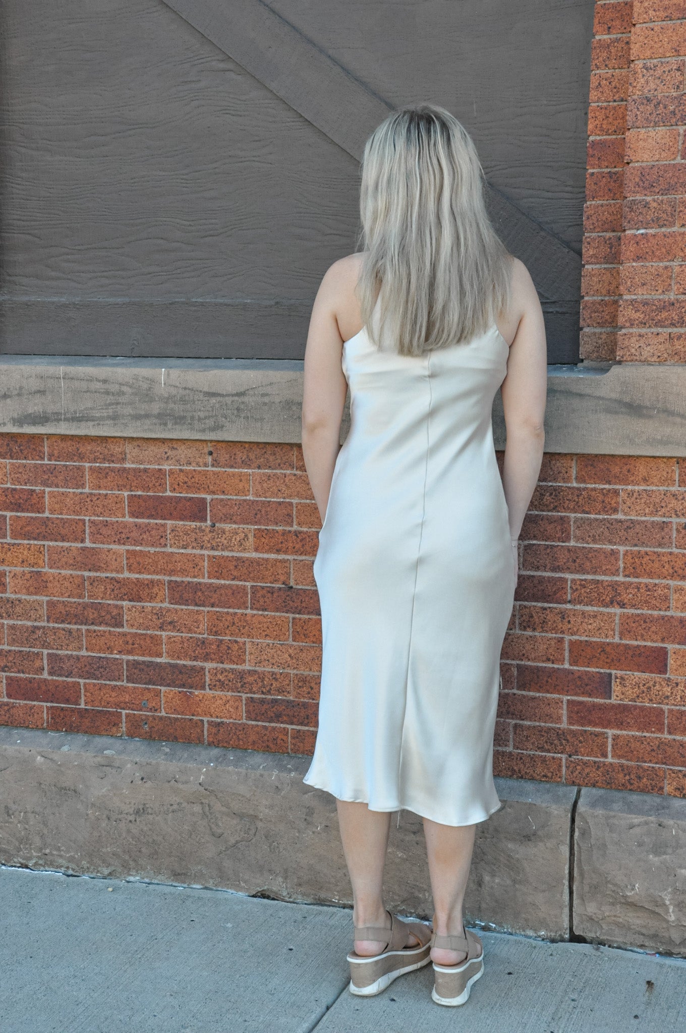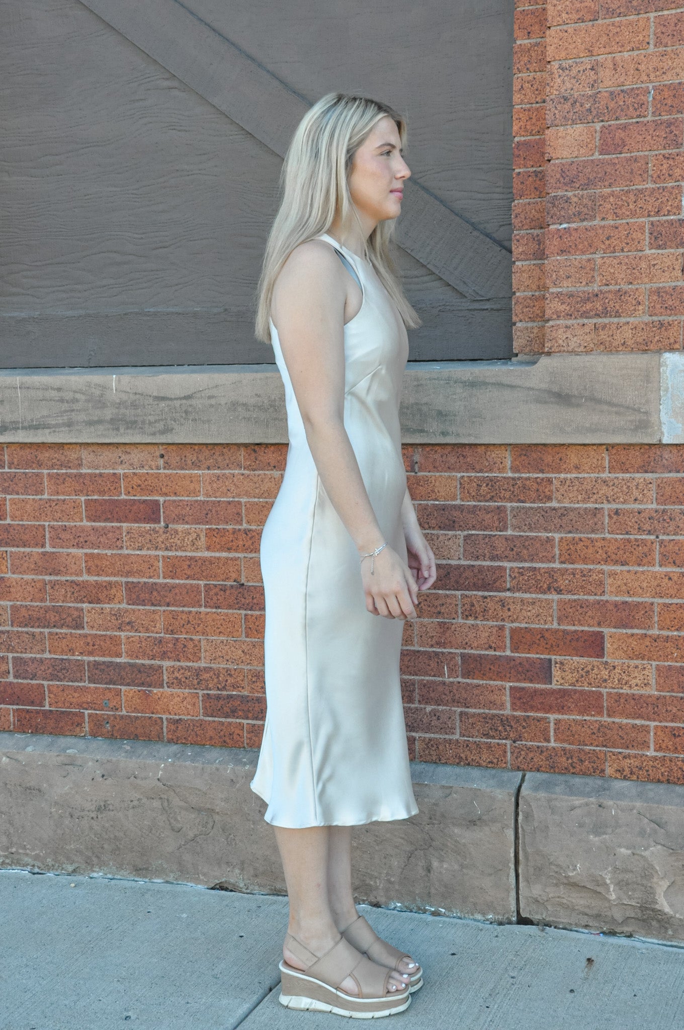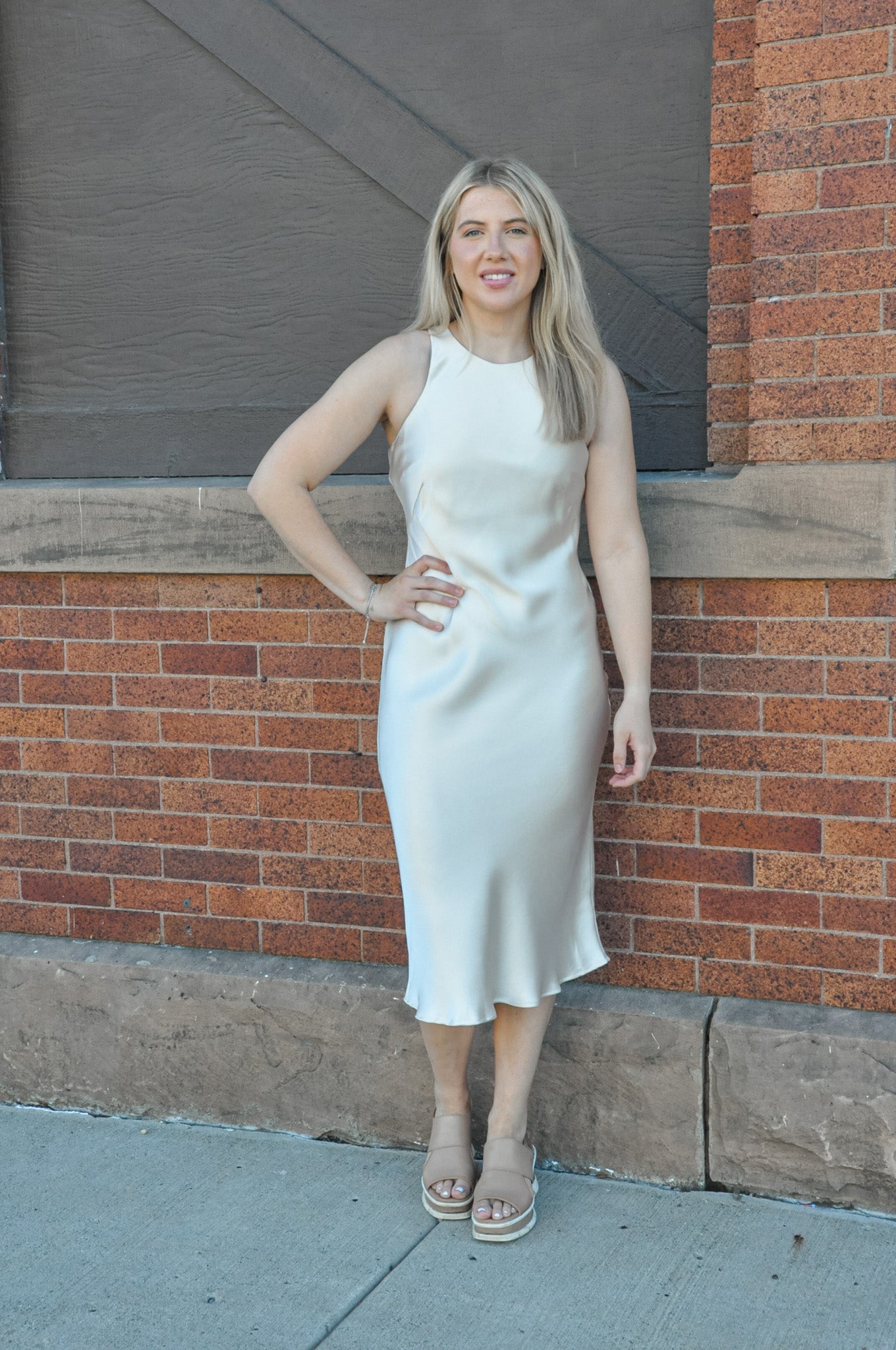 The Whisper Satin Midi Dress is the epitome of effortless elegance. Crafted from smooth, satin-like 100% polyester, this dress offers a luxe feel with a modern silhouette. It features a round neckline and chic cutaway shoulders that highlight the collarbone, while the fitted bodice flatters your shape before gently flowing into a relaxed midi-length hem. The sleek design offers just the right balance of structure and movement, making it ideal for everything from weddings and parties to date nights and special occasions. A subtle keyhole cutout at the back, finished with a delicate button closure, adds a touch of intrigue and polish to the minimalist look. Whether styled with heels and statement jewelry or kept simple with sandals and a clutch, the Whisper Satin Midi Dress promises a chic, put-together outfit every time. Lightweight and unlined, it’s a perfect piece for warm-weather elegance or layered looks in cooler months.