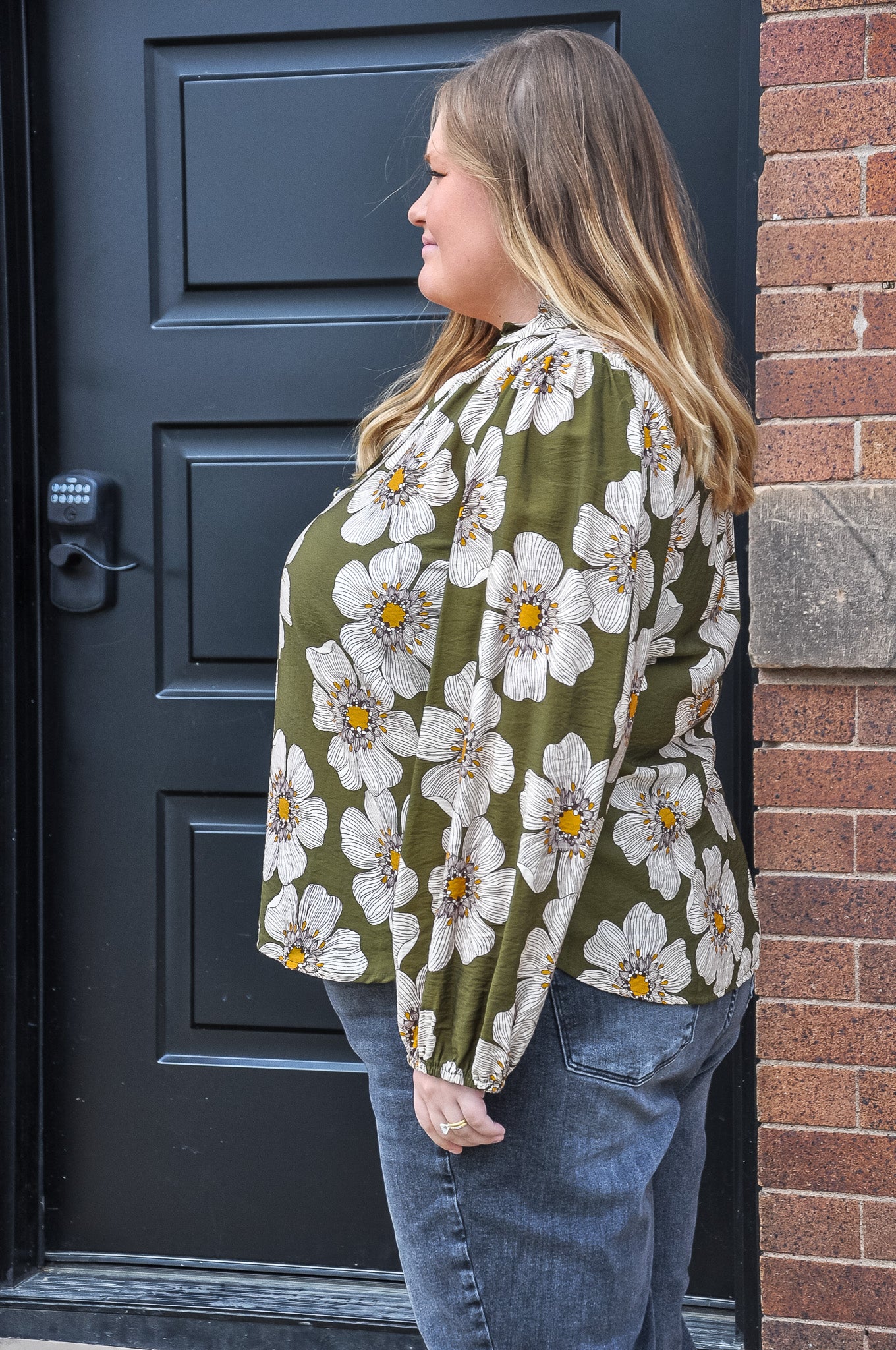 The Curvy Olive Multi Floral Blouse is a soft, feminine piece with timeless appeal. Crafted from a lightweight blend of 83% rayon and 17% nylon, it offers a smooth, breathable feel with a beautiful drape that flatters curvy silhouettes. The floral print in warm olive tones adds a touch of elegance, while the split neckline and gathered shoulders enhance its effortless charm. Elastic-cuffed long sleeves provide gentle volume and a comfortable fit, making it easy to wear from day to night. With a total length of 27½", this blouse pairs perfectly with denim, trousers, or skirts for a polished yet relaxed look. The Curvy Olive Multi Floral Woven Blouse combines comfort, style, and femininity—ideal for any season.