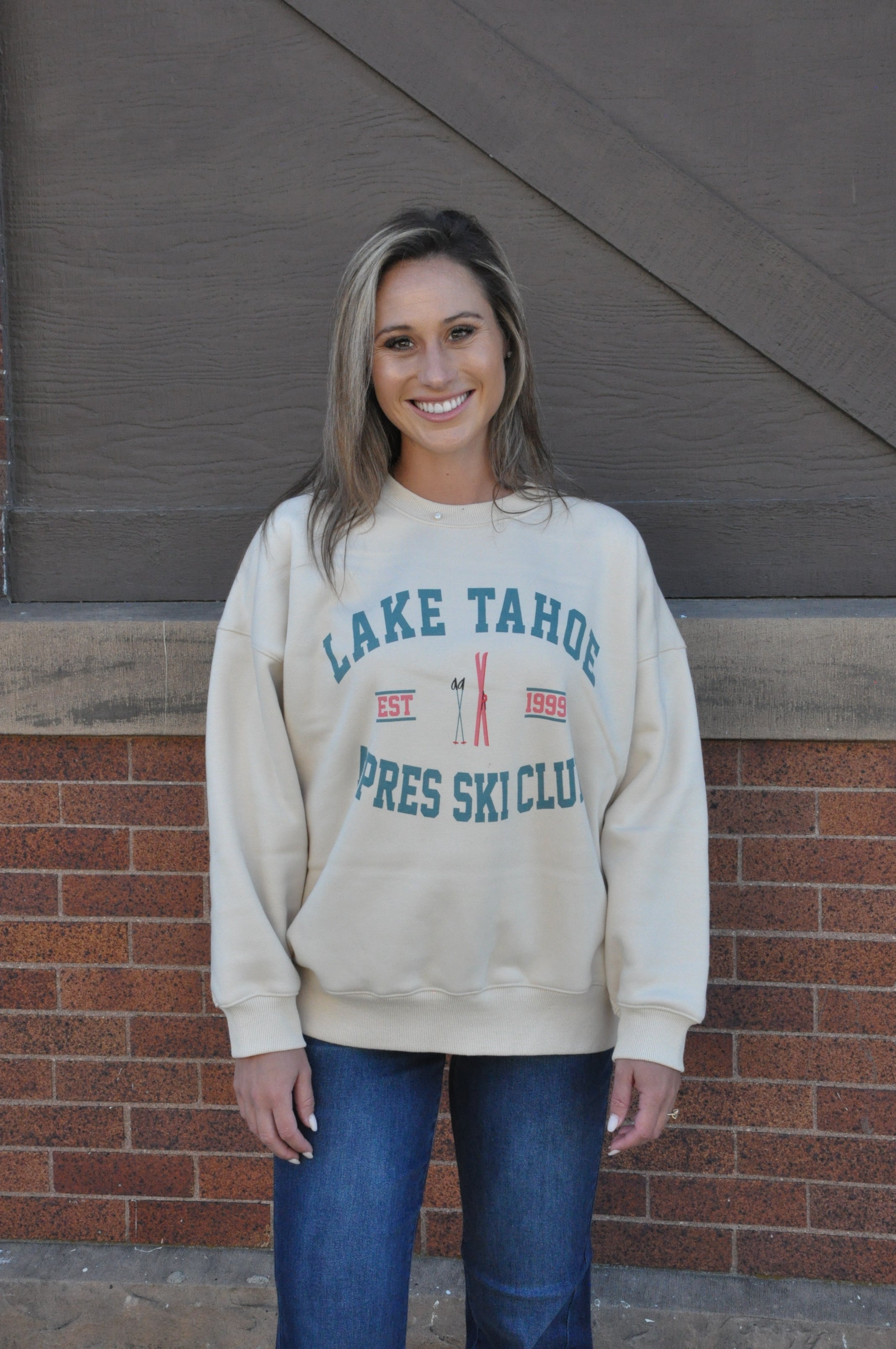The standout "Lake Tahoe Apres Ski Club" graphic adds a chic alpine vibe, making it ideal for après-ski relaxation or casual outings on chilly days. Its neutral light beige hue is versatile, pairing effortlessly with leggings, jeans, or cozy joggers.
