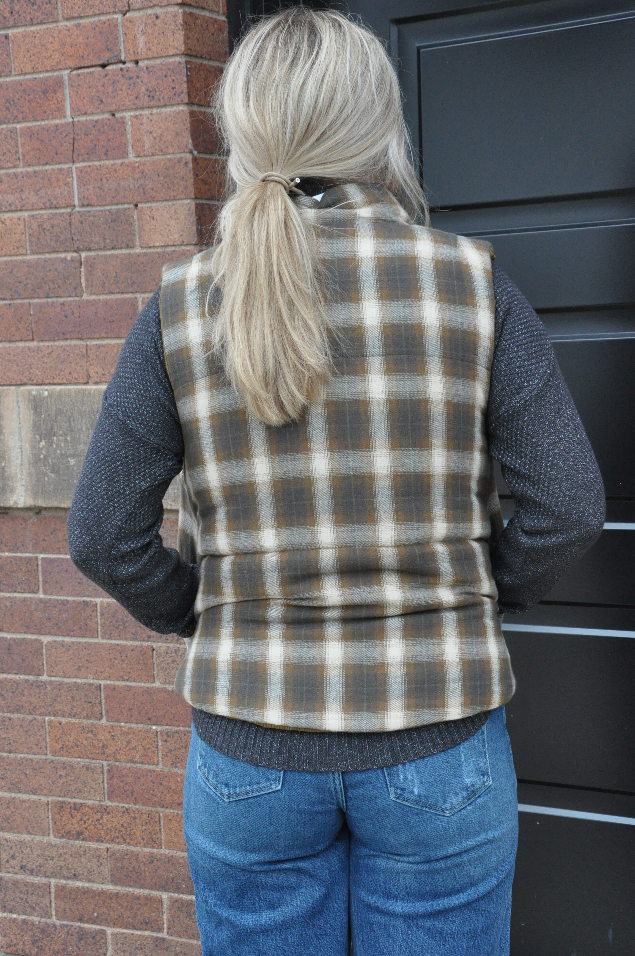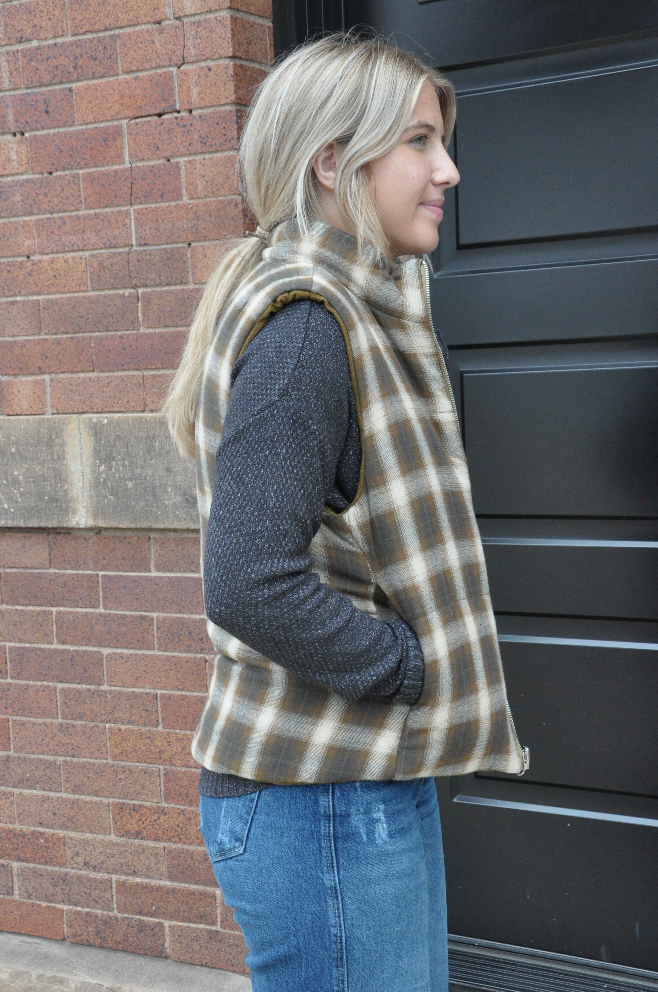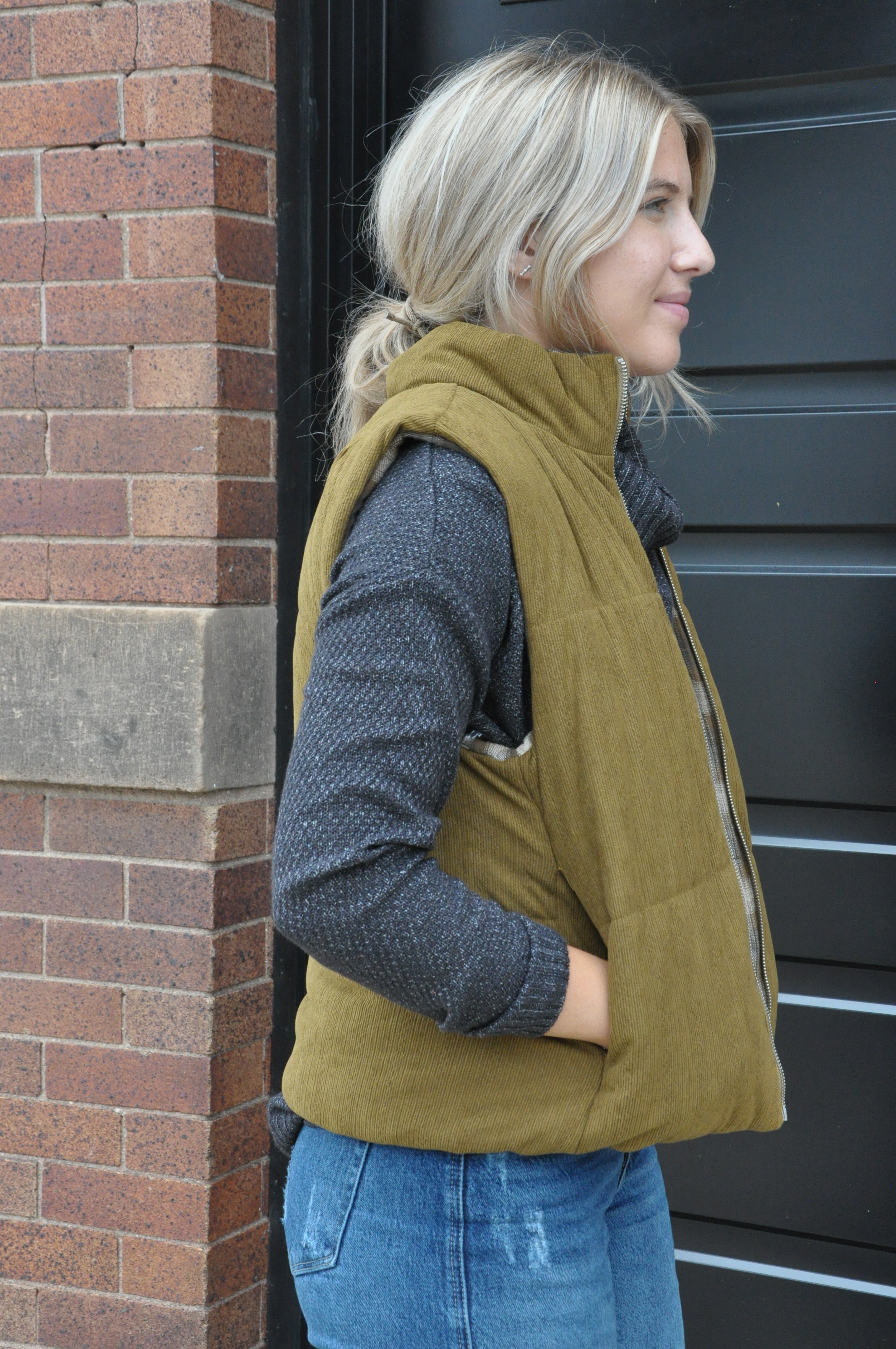 The Corduroy & Plaid Reversible Puffer Vest in Olive is a trendy and functional layering piece that combines style and warmth. Made from 100% polyester, this vest is designed to be lightweight yet insulated, making it ideal for cooler weather.