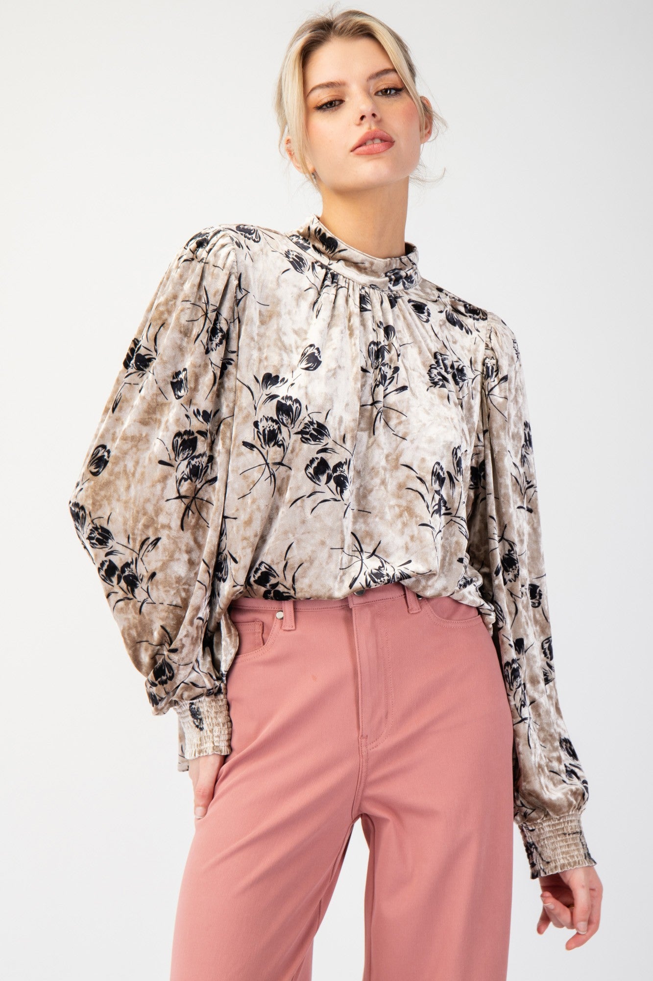 The Champagne Floral Velvet Top is a stunning, holiday-ready piece that adds a touch of elegance to any occasion. Crafted from a luxurious blend of 95% polyester and 5% spandex, this top is lightweight with a relaxed and loose fit, ensuring both comfort and style. It features long, dramatic bishop sleeves with smocked cuffs, and a mock neckline with delicate rouching, offering a sophisticated silhouette. The double button closure on the back and the rounded hem add refined details, while the floral print and metallic shine bring a festive, eye-catching sparkle perfect for holiday gatherings. This top effortlessly blends glamour with ease, making it an ideal choice for the holiday season or any special occasion.