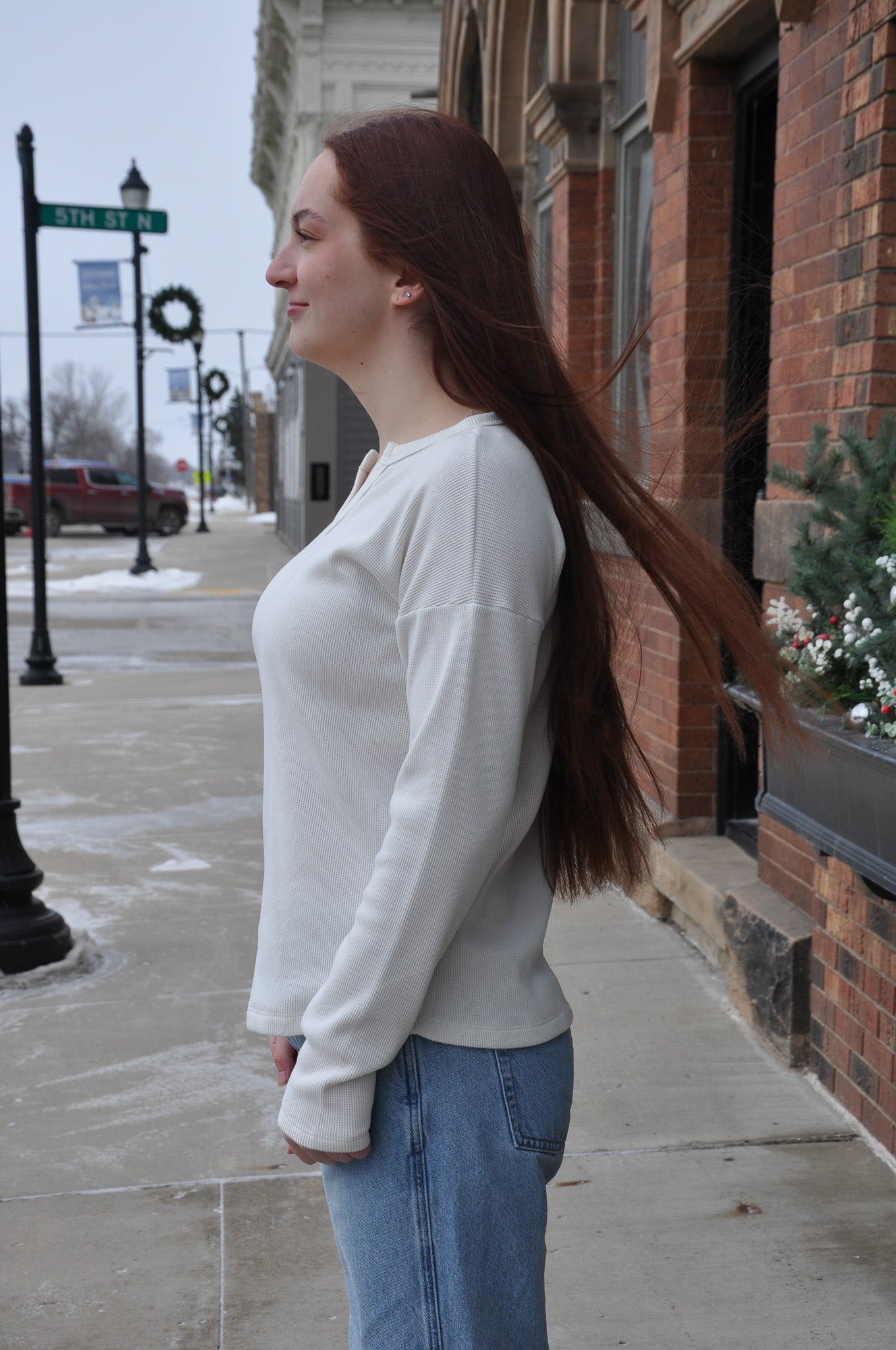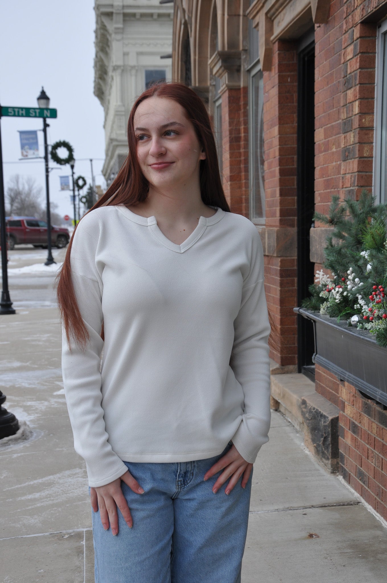 Designed with a split neckline, it adds a casual yet refined touch that elevates a simple basic into a chic wardrobe staple. The long sleeves provide added warmth, while the clean, solid ivory color makes it easy to pair with anything from denim to joggers to vests and jackets.