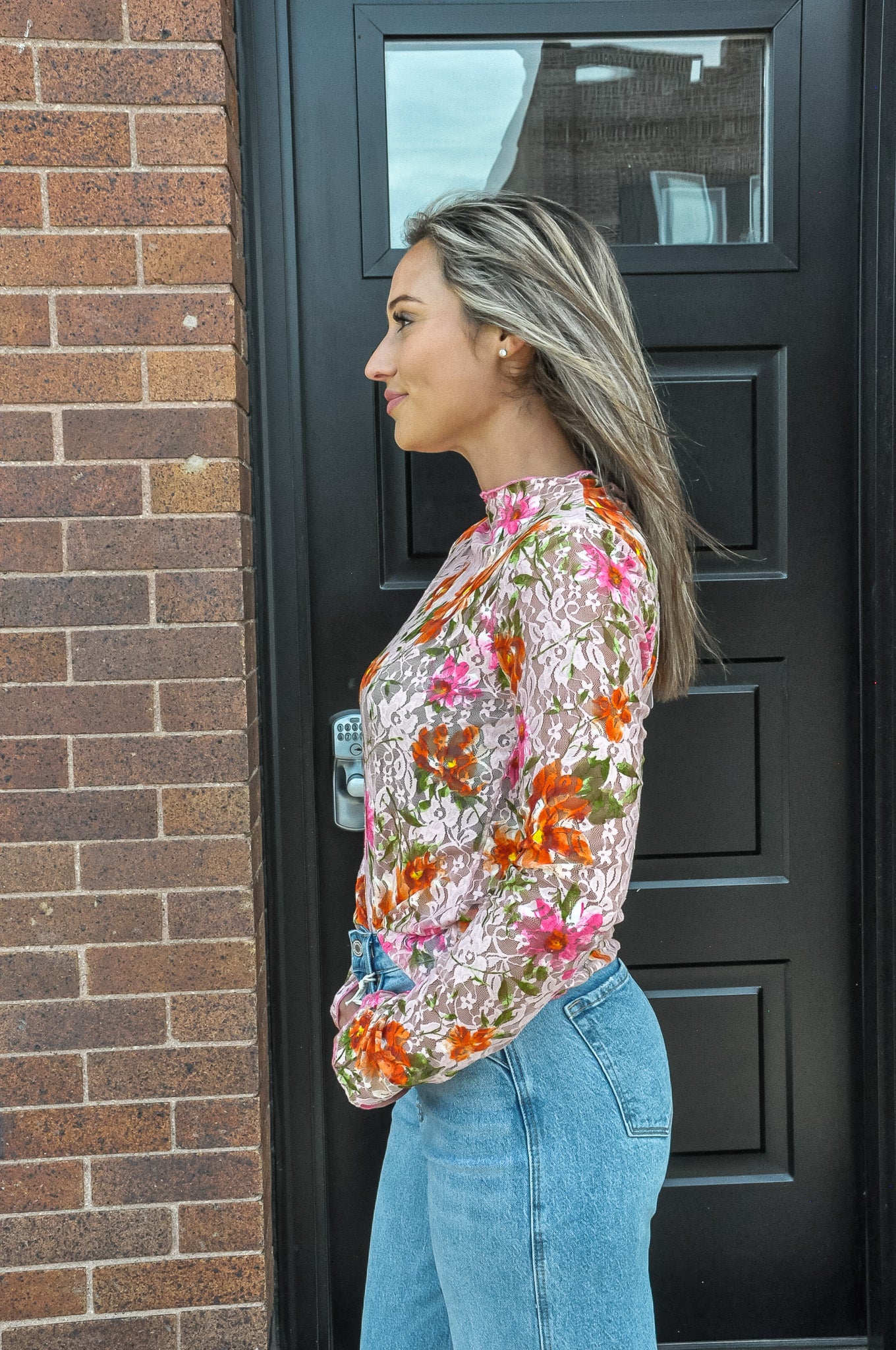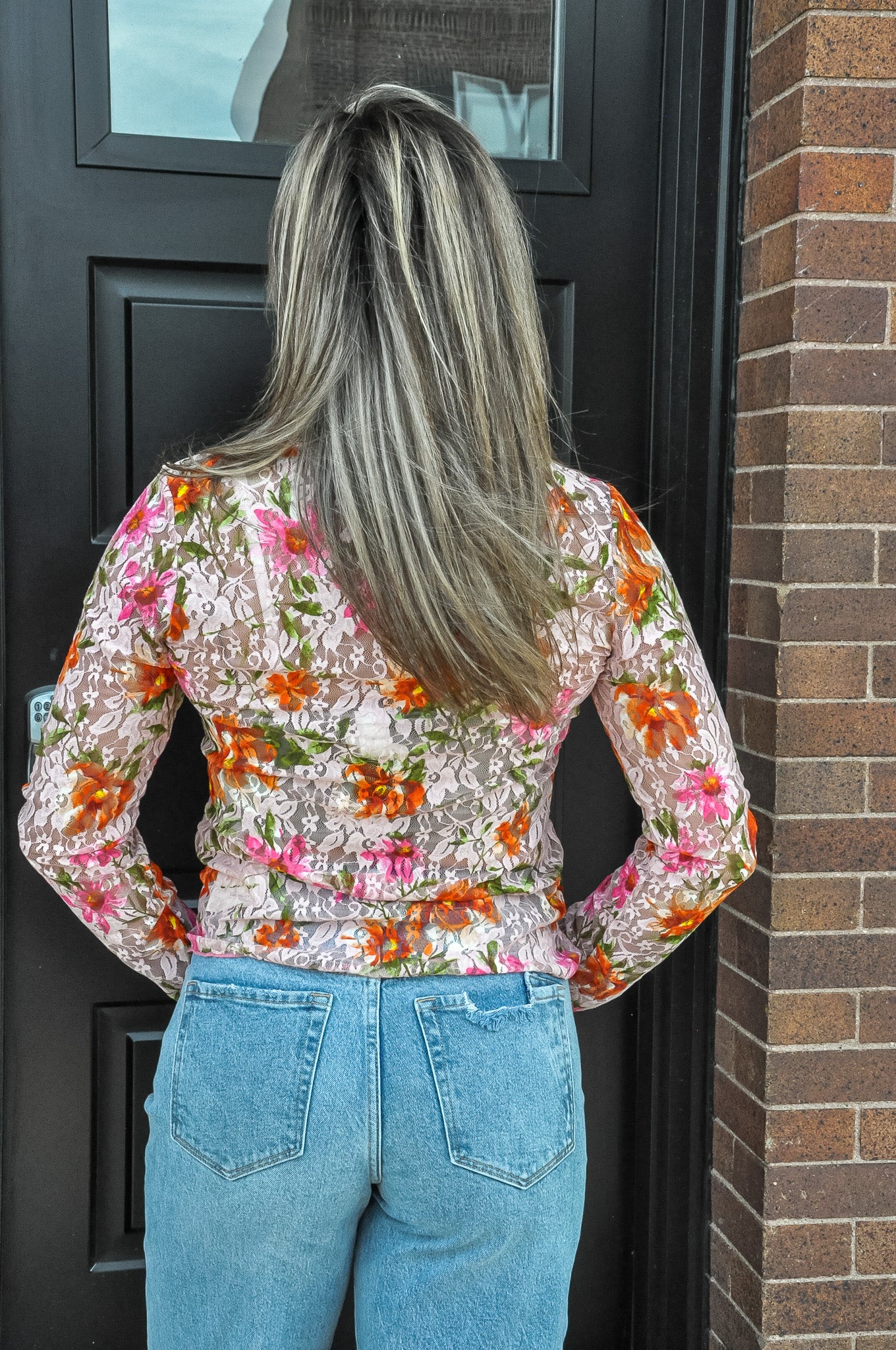 The Long Sleeve Merrow Hem Floral Mesh Top in Pink-Multi Floral is a delicate, feminine piece that adds a romantic touch to any outfit. Crafted from sheer, lightweight mesh, this top features an allover floral print in soft pinks, yellows, and greens that evoke a fresh, springtime feel. The fitted silhouette and stretchy fabric hug the body comfortably, making it perfect for layering over a tank or bralette. The merrow lettuce-edge hems at the sleeves and bottom add a playful, ruffled finish, enhancing the top’s dreamy aesthetic. With its long sleeves and crew neckline, this piece offers both style and versatility—dress it up with a midi skirt and heels, or keep it casual with denim and boots. Whether you're heading out for brunch or adding a whimsical flair to your everyday wardrobe, this top brings charm and ease to your look. Lightweight, breathable, and easy to style, it’s a standout choice for all seasons.