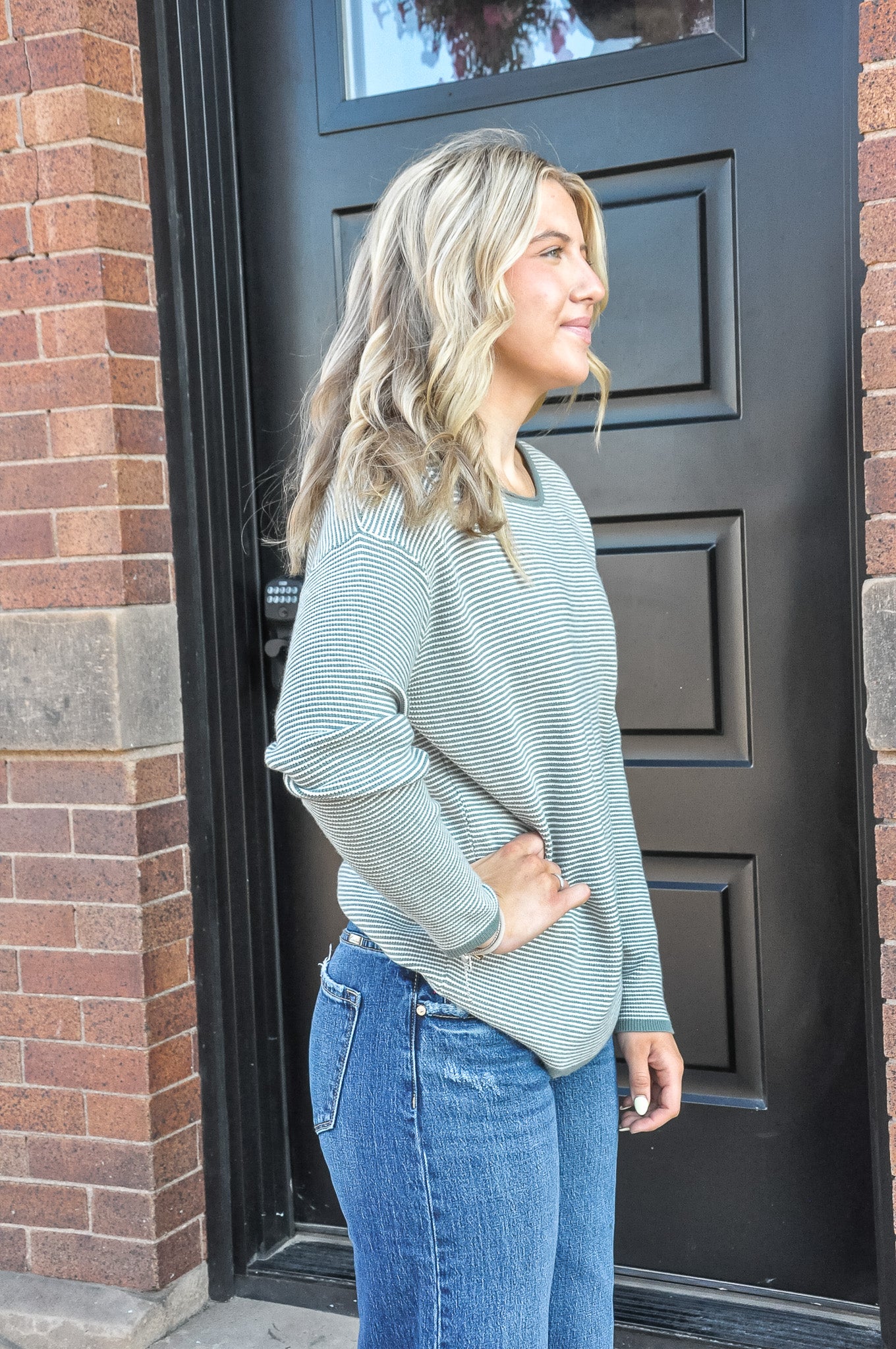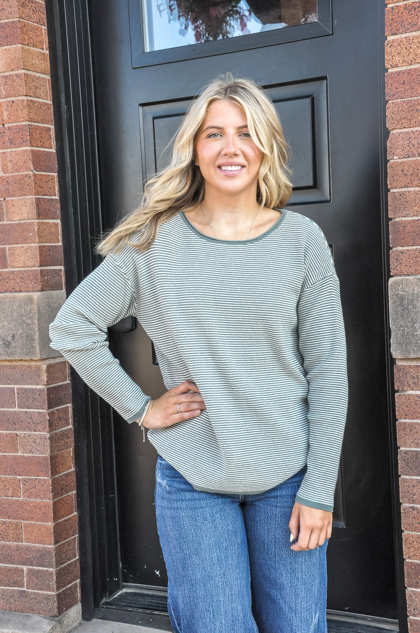 The Waffle Textured Pullover Sweater in Dark Sage or Taupe is the perfect blend of comfort and subtle sophistication. Featuring a cozy waffle texture with understated pinstriped detailing, this long sleeve pullover offers a stylish twist on a classic favorite. The wide crew neckline adds a relaxed, modern touch, making it easy to layer or wear on its own. Crafted from a soft, breathable blend of 55% viscose and 45% nylon, it drapes beautifully while providing lightweight warmth. Whether you're lounging at home or stepping out in casual style, this sweater delivers effortless versatility and timeless charm.