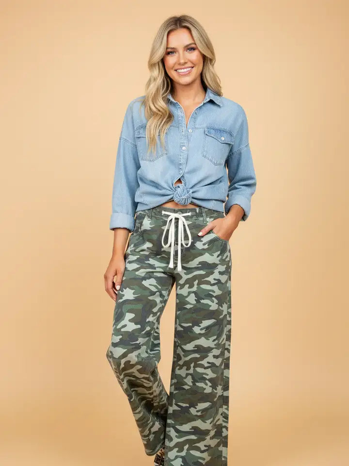 Camo Wide Leg Drawstring Denim Pants in Green - Elevate your casual wardrobe with these camouflage wide leg denim pants. Featuring a striking camo print and relaxed silhouette, they deliver effortless style with modern flair. Crafted from durable denim, these pants provide all-day comfort without compromising on durability. The adjustable drawstring waist allows you to customize your fit for a secure, personalized wear. Perfect for creating laid-back looks that feel both comfortable and fashion-forward. Cotton/Spandex