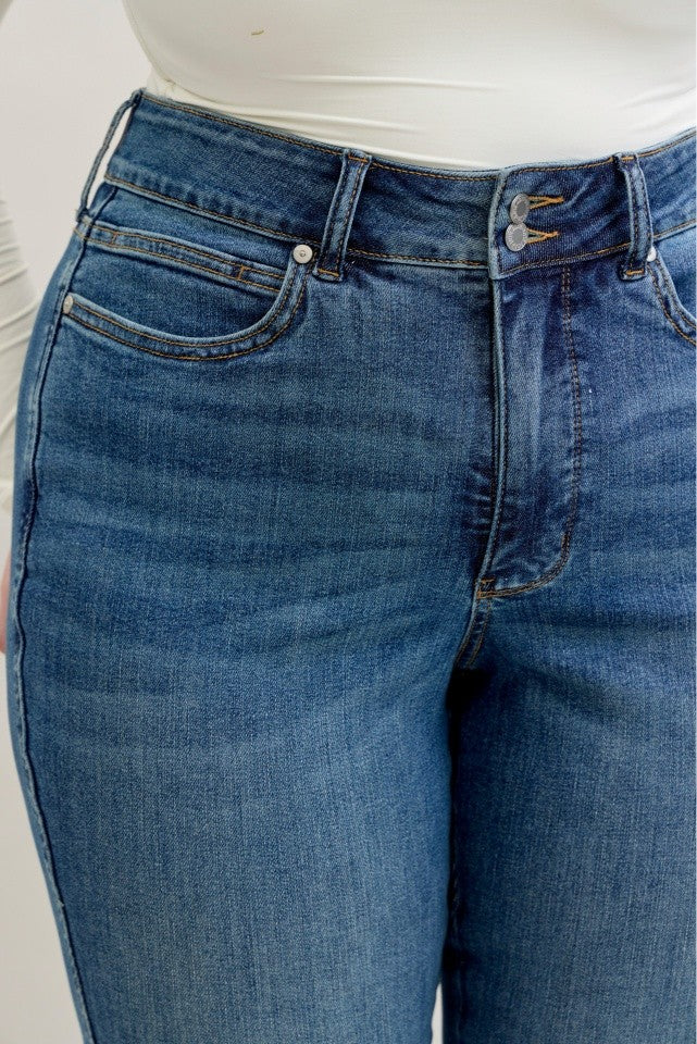 The Judy Blue Curvy High Waist Flare Jeans with Tummy Control and Double Button Waistband are designed to flatter, support, and elevate your everyday denim game. Crafted in a classic medium wash, these jeans offer timeless appeal with a modern, curve-enhancing silhouette. The high-rise waist (12 1/4") features a tummy control panel and double button closure that smooths and holds comfortably without feeling restrictive, creating a confident, streamlined fit. The subtle flare leg paired with a 33" inseam elongates the legs and balances proportions beautifully, making them perfect for styling with boots, wedges, or heels. Made from a premium blend of 91% cotton, 7% polyester, and 2% spandex, they provide structure with just the right amount of stretch for all-day comfort and movement. These jeans hug in all the right places while offering breathable, flexible wear. Whether dressed up or down, they are a go-to staple for effortless style, comfort, and flattering confidence.