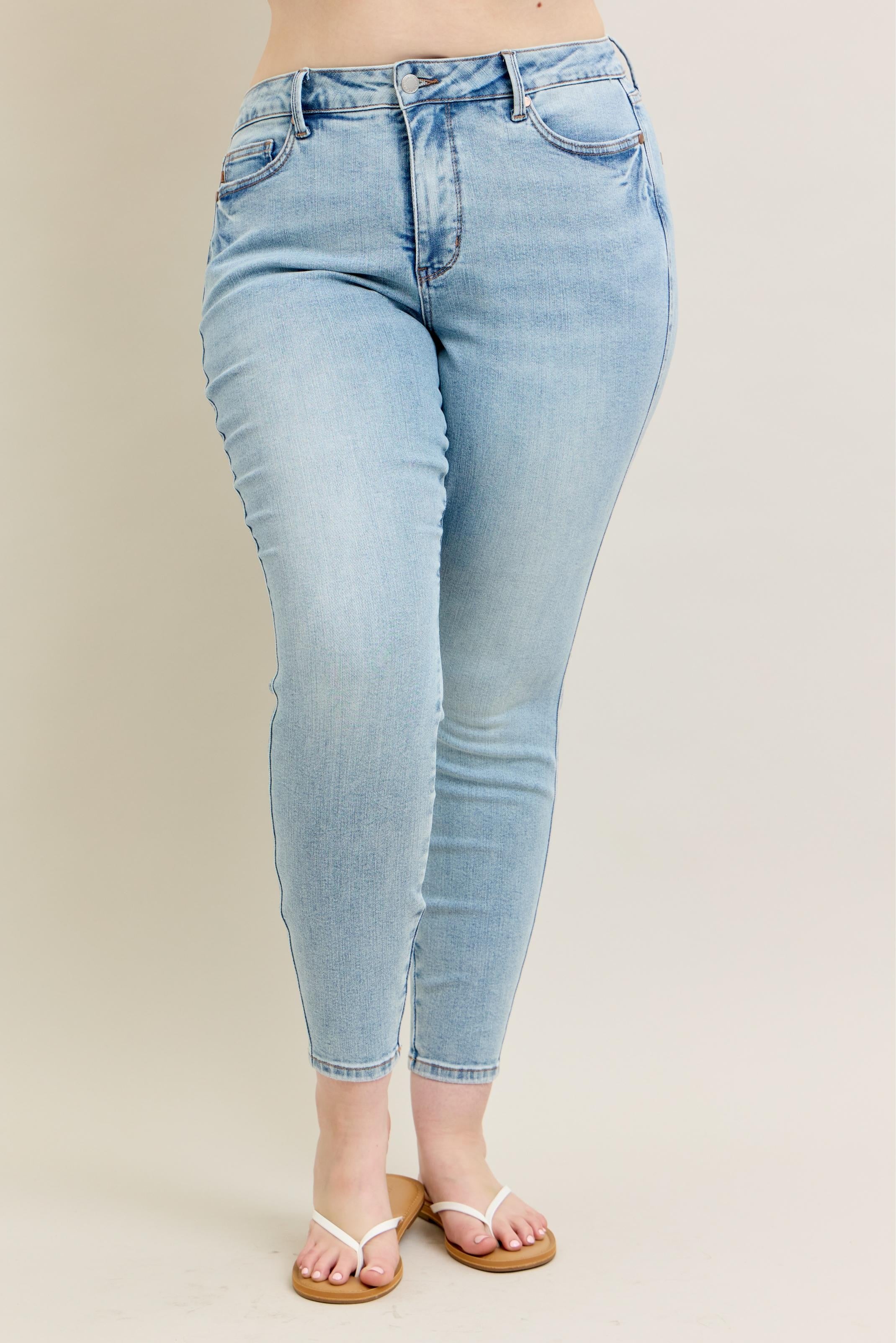 The Curvy Judy Blue Tummy Control Vintage Wash Skinny Jeans in Light Wash are designed for both comfort and confidence. Made from a soft, stretchy blend of 91% cotton, 7% polyester, and 2% spandex, these jeans feature a flattering mid-rise fit with a built-in tummy control panel that smooths and supports your shape. The light vintage wash adds a touch of timeless charm, while the skinny leg silhouette elongates and flatters every curve. With an 11 ¾" front rise and 29" inseam, they’re perfect for pairing with your favorite boots, sneakers, or heels. The Curvy Judy Blue Tummy Control Skinny Jeans deliver the ideal blend of stretch, style, and everyday wearability.
