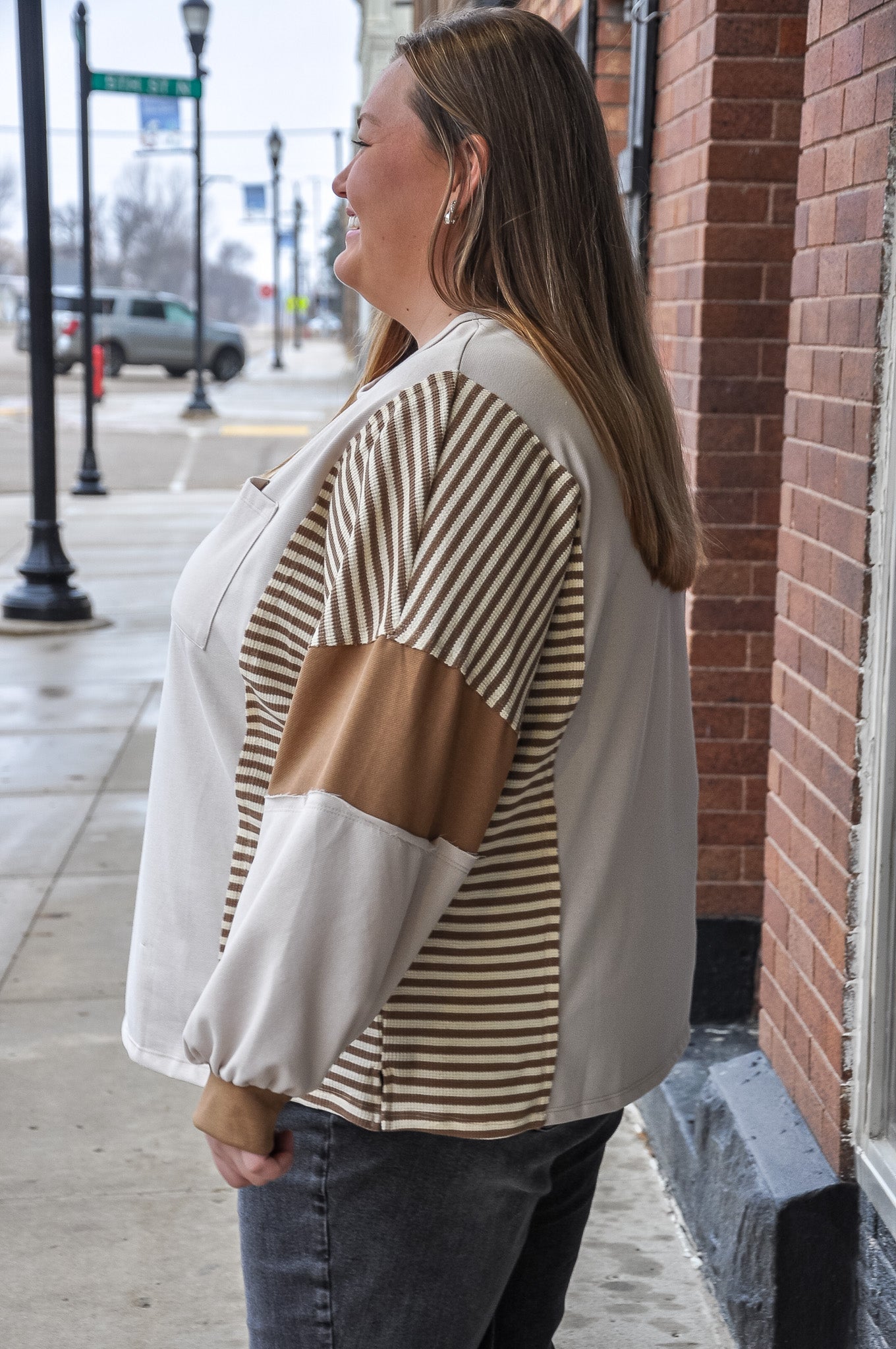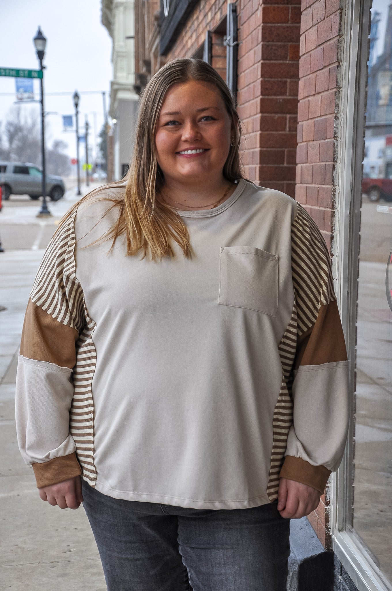Sporty, modern, and effortlessly flattering, the Plus Stripe and Color Block Sleeve Detail Knit Top in Taupe is the perfect blend of comfort and style. Crafted from soft striped knit fabric, this top offers a lightweight feel with just the right amount of stretch for all-day wear. The classic round neckline keeps the silhouette timeless and easy to style, while the standout color block sleeve detail adds a fun, eye-catching twist. Finished with cuff sleeves for a polished touch, it brings structure to the relaxed fit without sacrificing comfort. The neutral taupe tones make it incredibly versatile — pair it with your favorite denim, leggings, or casual trousers for an easy, put-together look. Designed with curves in mind, this top offers a flattering fit that feels as good as it looks. It’s the perfect everyday piece with just enough detail to make it special.