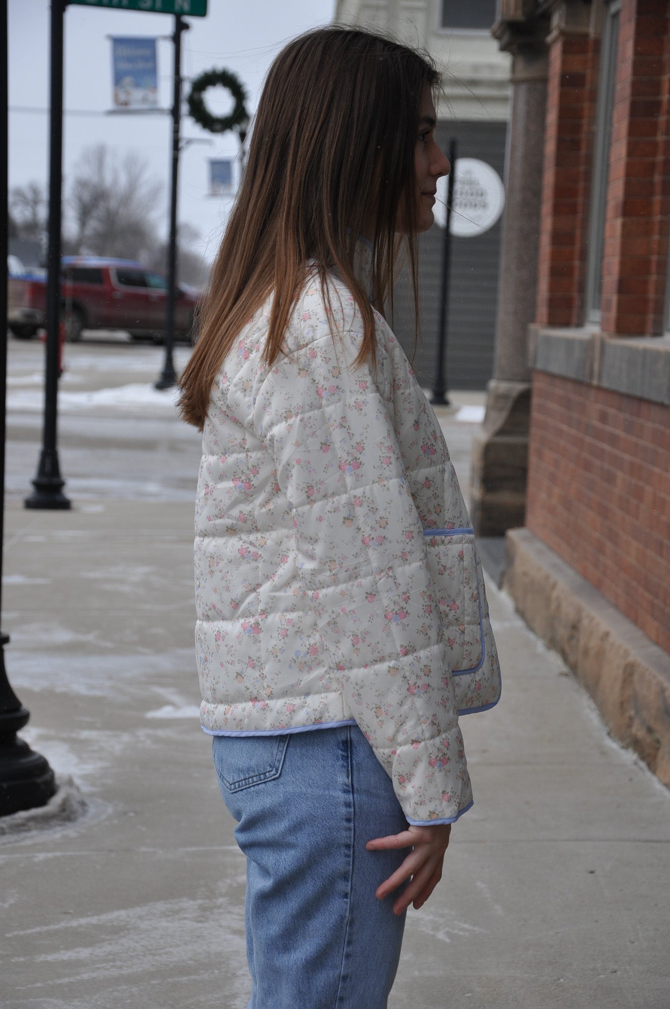 The Floral Printed Quilted Jacket in ivory is a charming blend of cozy comfort and feminine style. Featuring an allover floral print, this jacket brings a soft, vintage-inspired touch to your outerwear collection. The quilted design adds warmth and texture, making it a perfect lightweight layer for cool mornings, breezy days, or transitional seasons.