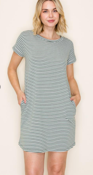 The Pinstriped Shift Dress with Pockets in ivory and green is a fresh and effortless piece that combines classic style with everyday comfort. Featuring a subtle pinstripe pattern, this dress offers a timeless look with a soft, modern feel that works for a variety of occasions.