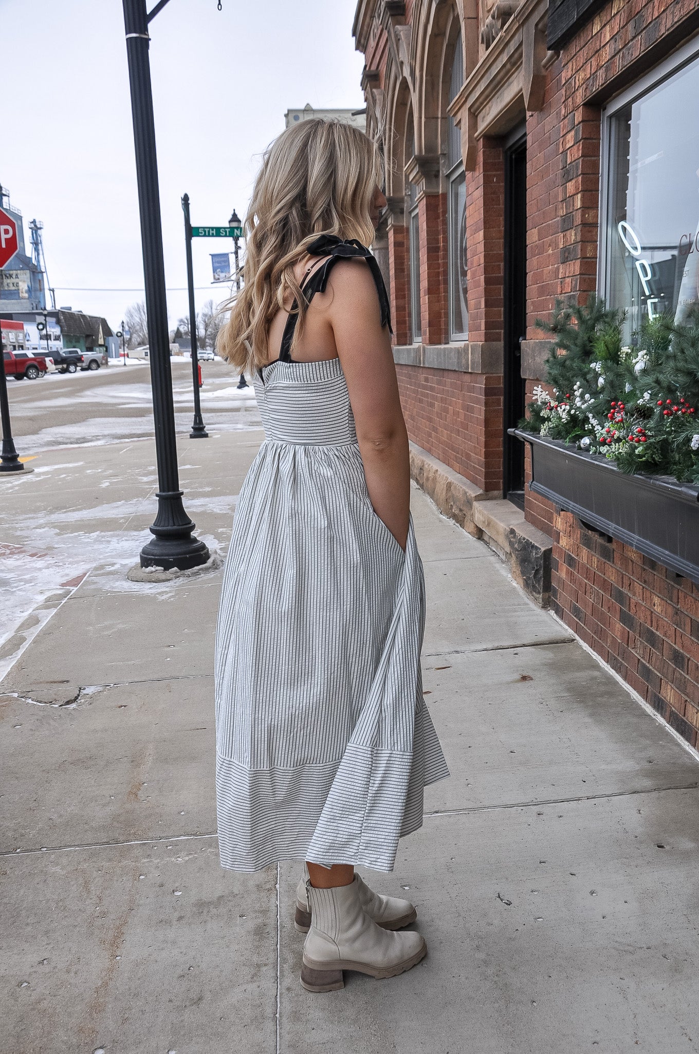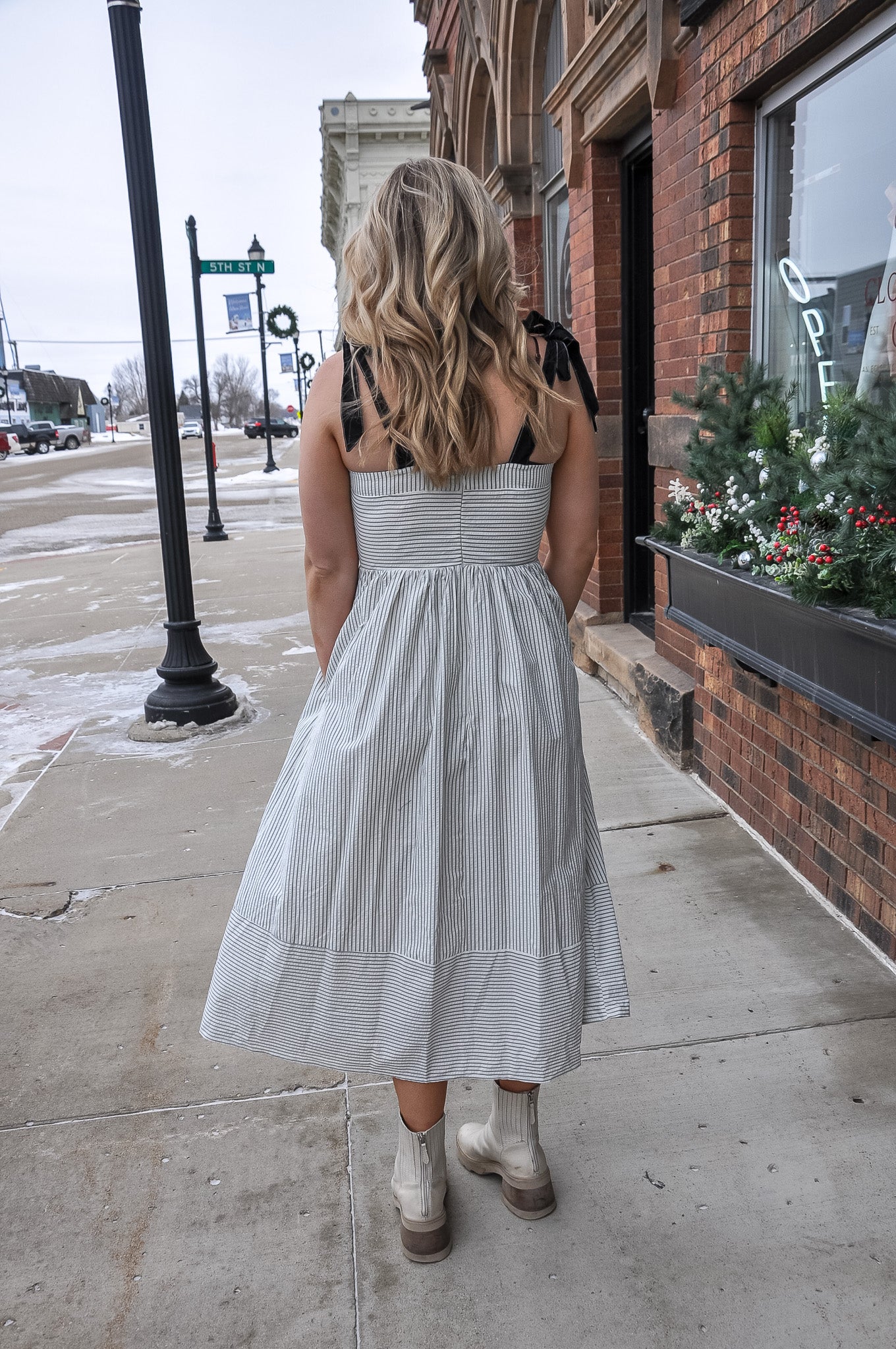The Ribbon Tied Sleeveless Striped Midi Dress is a timeless and feminine piece designed for easy elegance. Crafted from a lightweight woven fabric, this dress features classic stripes that add a clean, fresh look perfect for warm-weather days. The sleeveless silhouette is accented with delicate contrast ribbon ties at the shoulders, adding a charming detail while allowing for an adjustable, comfortable fit. A flattering midi length creates a graceful flow, making it ideal for both casual outings and dressed-up occasions. Thoughtfully designed side pockets add everyday practicality without sacrificing style. The off white color palette keeps the look soft, neutral, and endlessly versatile. Style it with sandals for daytime errands, brunch, or vacations, or dress it up with wedges and statement jewelry for dinners or events. Easy to wear and easy to love, this striped midi dress blends comfort, femininity, and classic style into one effortless wardrobe staple.