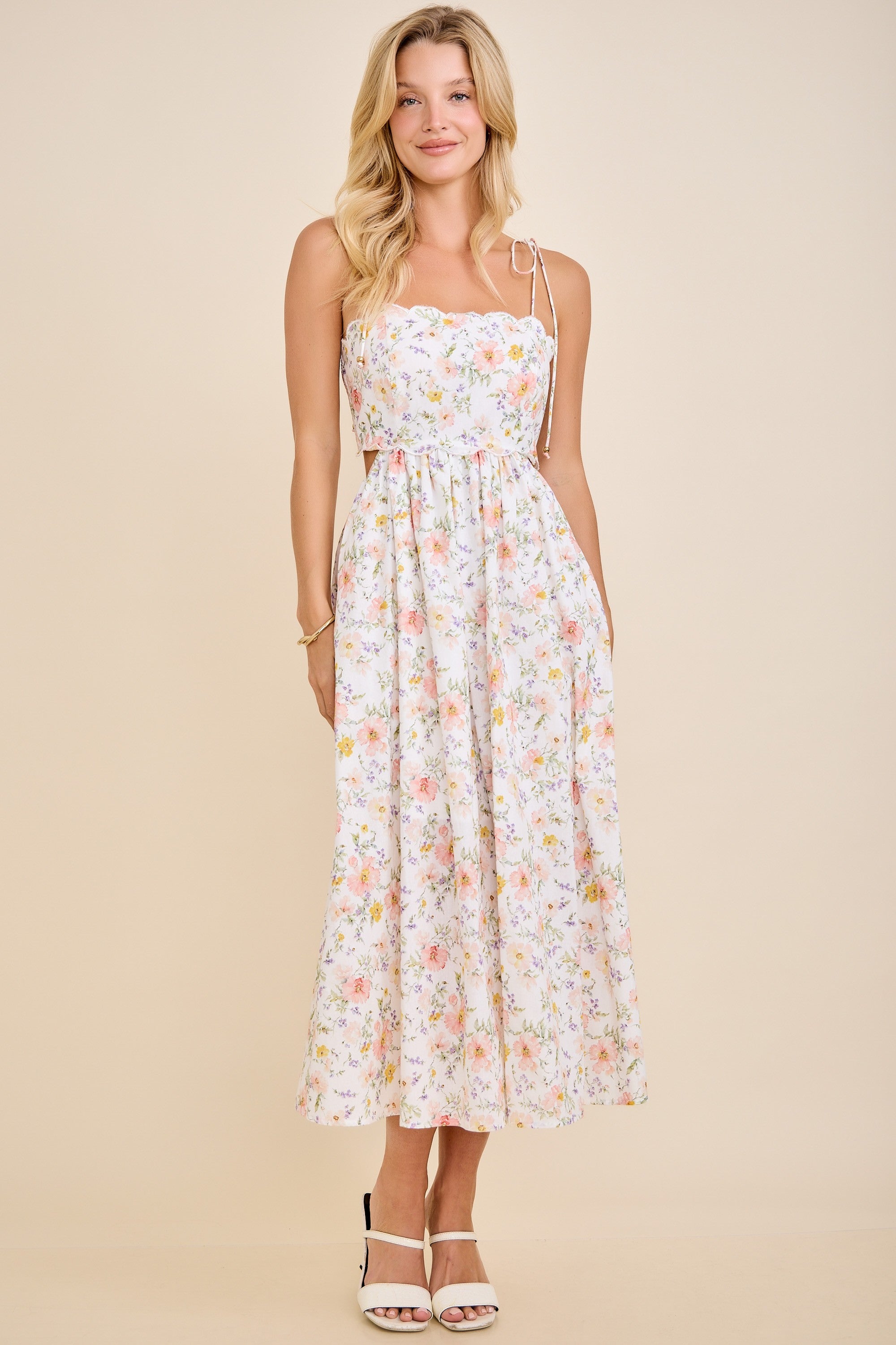 Feminine, fresh, and full of romantic charm, the Scallop Edge Tie Shoulder Floral Midi Dress is a beautiful choice for sunny days and special moments. Designed in a white multi floral print, this dress features an embroidered scallop edge neckline that adds delicate detail and timeless appeal. Adjustable tie shoulder straps allow for a customizable fit, while the smocked back provides comfort and a flattering shape that moves with you. The flowy, gathered midi skirt creates an effortlessly elegant silhouette, perfect for warm-weather outings. Whether you’re headed to brunch, a picnic, a garden party, or a vacation getaway, this dress feels light, breezy, and polished all at once. Easy to dress up with wedges or keep casual with sandals, it’s a versatile staple for the season. Crafted from 100% cotton, this floral midi dress offers breathable comfort and a soft, natural feel you’ll love wearing all day long.