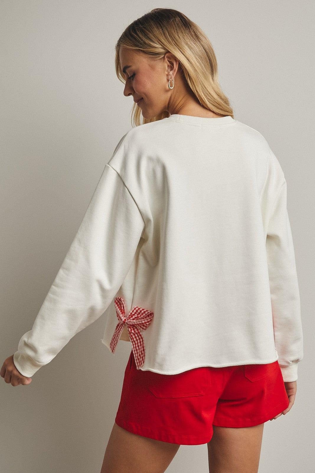 Sweet, sporty, and full of charm, the Side Gingham Bow Pullover is a standout casual piece with playful detail. Designed in an off-white and red color combo, this pullover features a classic, comfortable fit with side slits for easy movement and a relaxed silhouette. The gingham bow contrast adds a fun, feminine twist that makes this top feel unique while still being effortlessly wearable. Perfect for pairing with denim, shorts, or leggings, it’s an easy go-to for everyday style with a little extra personality. Crafted with a soft 100% cotton self fabric, this pullover offers breathable comfort, while the contrast detail is made from a 50% cotton and 50% polyester blend for durability. Finished with a rib trim of 80% cotton, 15% polyester, and 5% spandex, it provides the perfect amount of stretch and structure. Cozy, cute, and versatile, this pullover is sure to become a favorite.