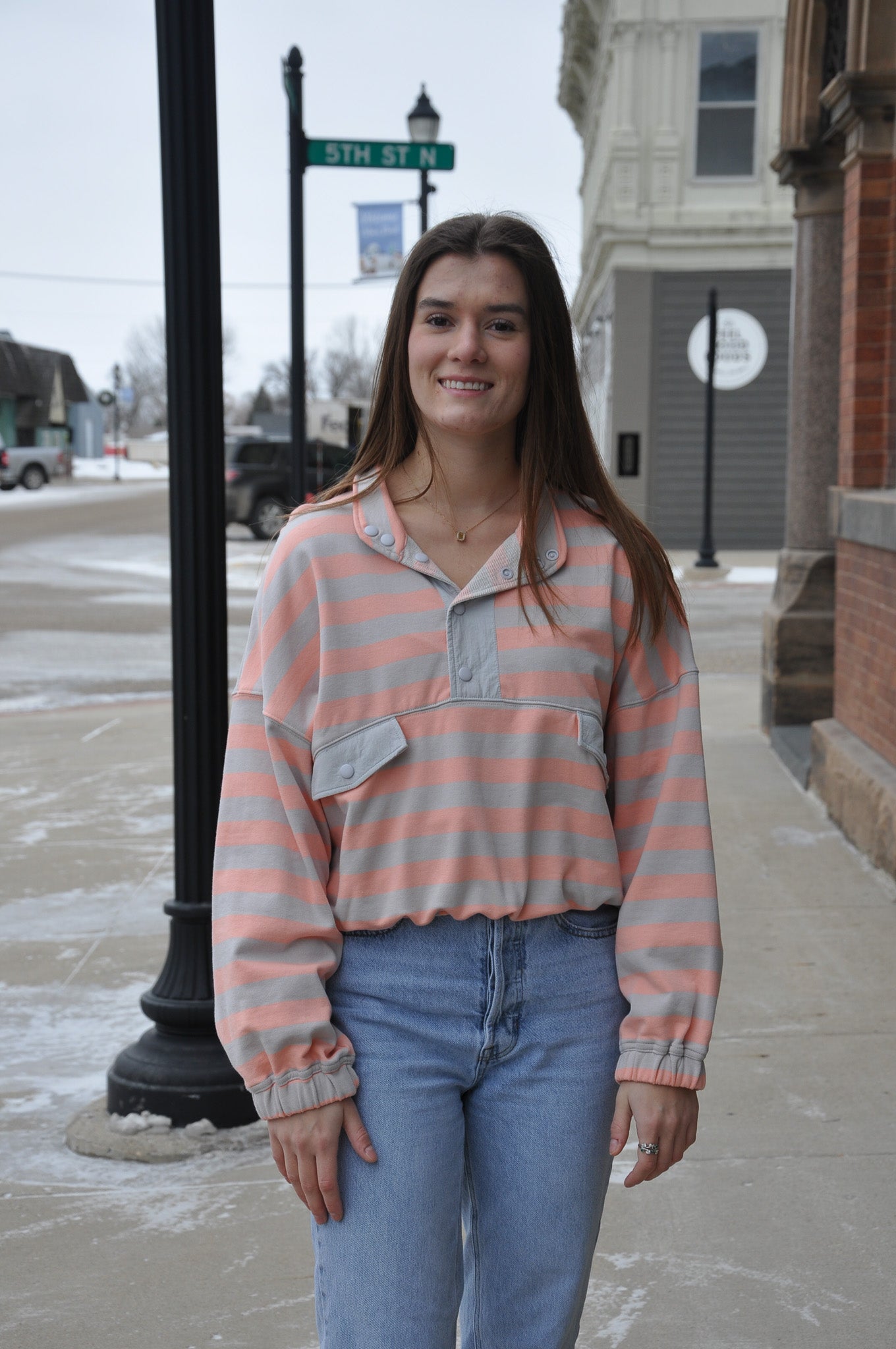 The Stripe French Terry Semi Button Up Top by Peach Love in Grey/Salmon is a cozy yet polished piece designed for effortless everyday wear. Made from 100% cotton French terry, this top offers a soft, breathable feel with just the right amount of structure. The semi button-up neckline adds a relaxed, casual touch while still giving you styling versatility—wear it buttoned for a clean look or slightly open for an easy, laid-back vibe. Long sleeves provide comfortable coverage, making this top ideal for transitional seasons and cooler days. The grey and salmon stripe combination brings subtle color and visual interest without feeling overpowering, keeping the look fresh and wearable. Designed with comfort in mind, this top pairs perfectly with denim, leggings, or casual trousers for an easy outfit you’ll reach for again and again. Whether you’re running errands, lounging at home, or meeting friends for coffee, this French terry top blends softness, style, and everyday practicality beautifully.