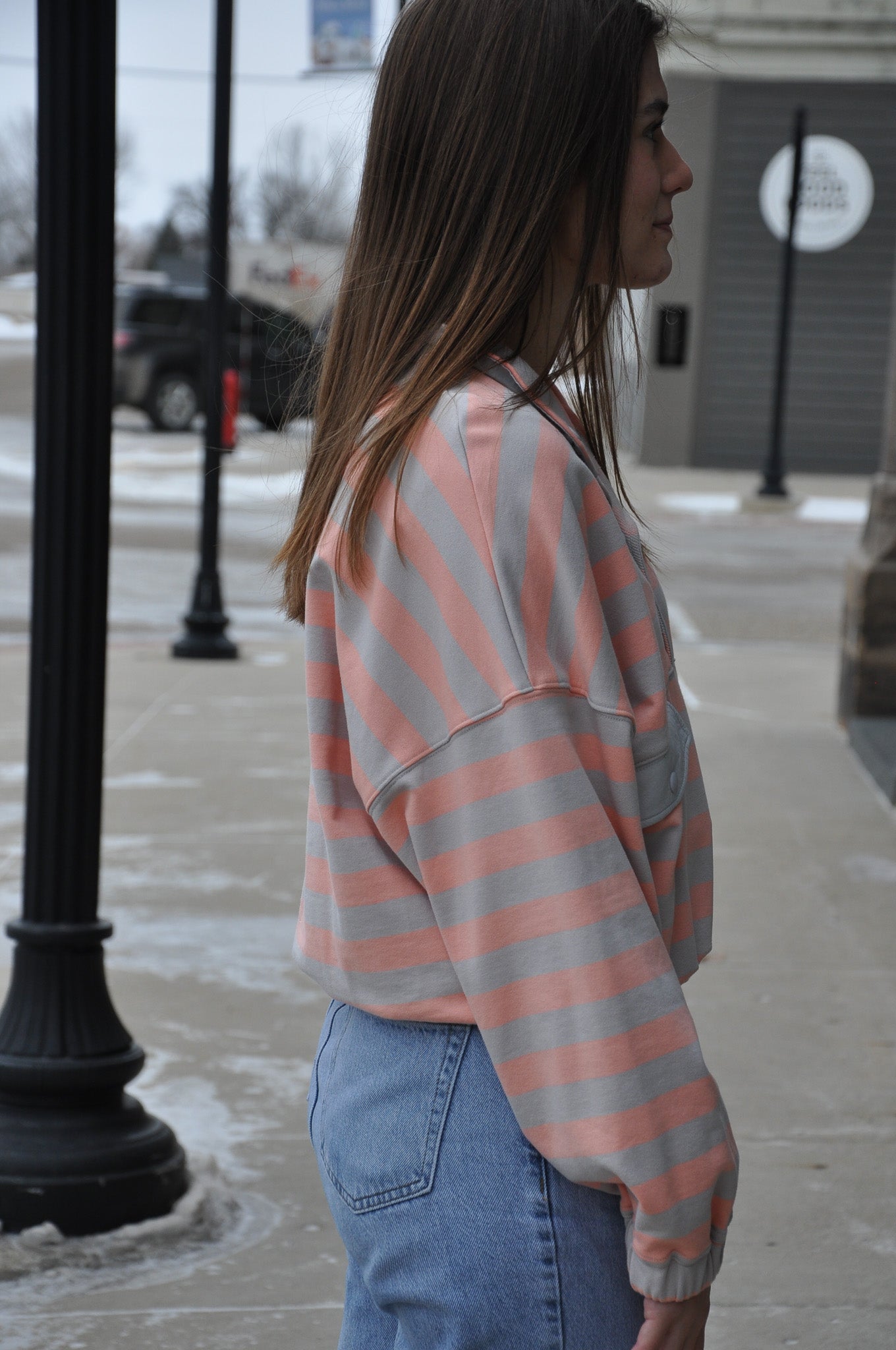 Stripe French Terry Semi Button Up Top