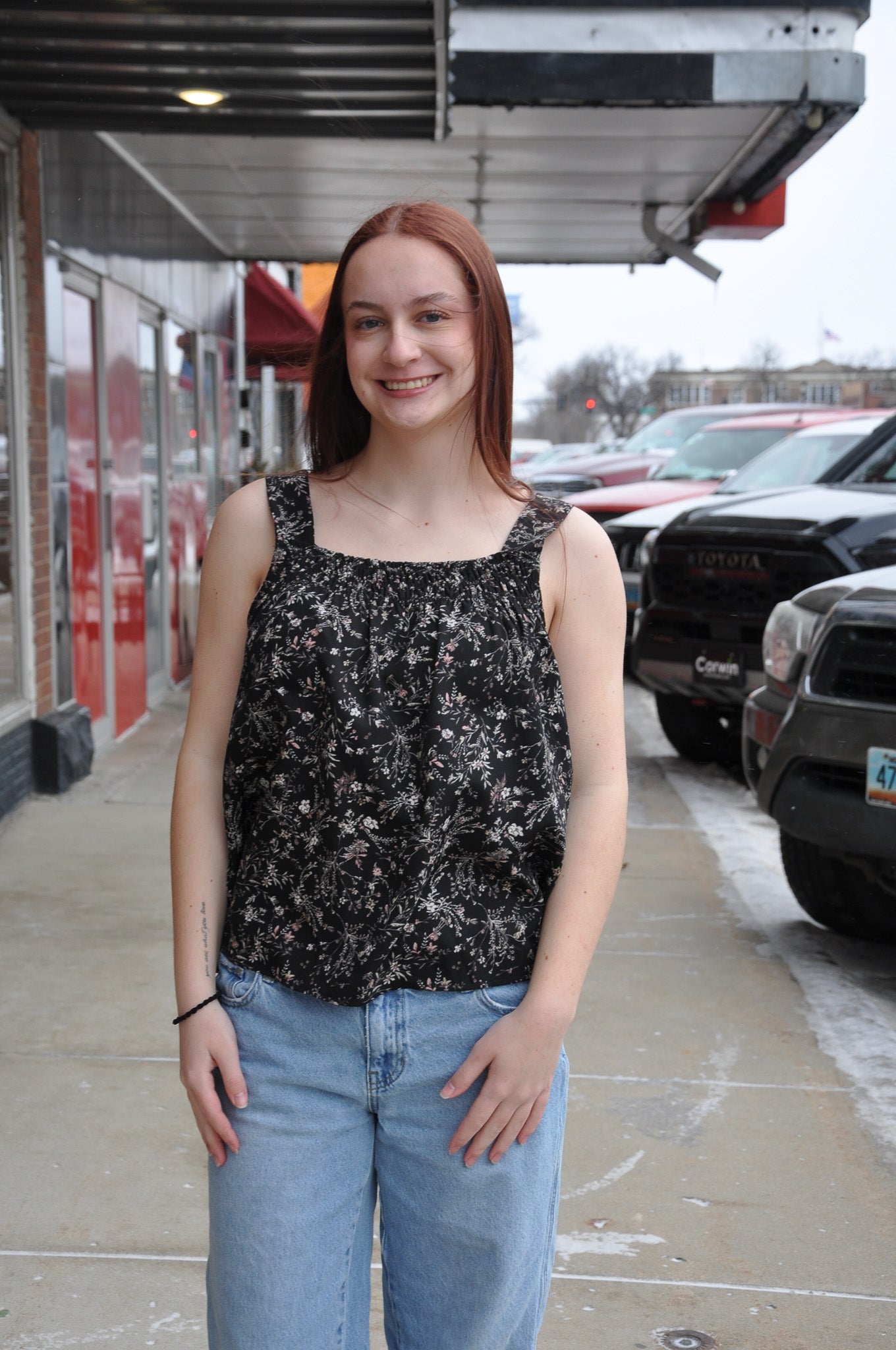 The Wide Strap Sleeveless Floral Smocked Top in Black is a charming and feminine piece perfect for warm-weather days. Crafted from 100% polyester, it features a flattering square neckline and a fully smocked chest for a comfortable, form-fitting silhouette. The wide straps provide a secure, easy fit, while the floral print adds a touch of timeless elegance. Lightweight and breezy, this sleeveless tank pairs beautifully with denim, skirts, or shorts for a casual yet polished look. The Wide Strap Floral Smocked Top delivers effortless style with a romantic, summery feel.