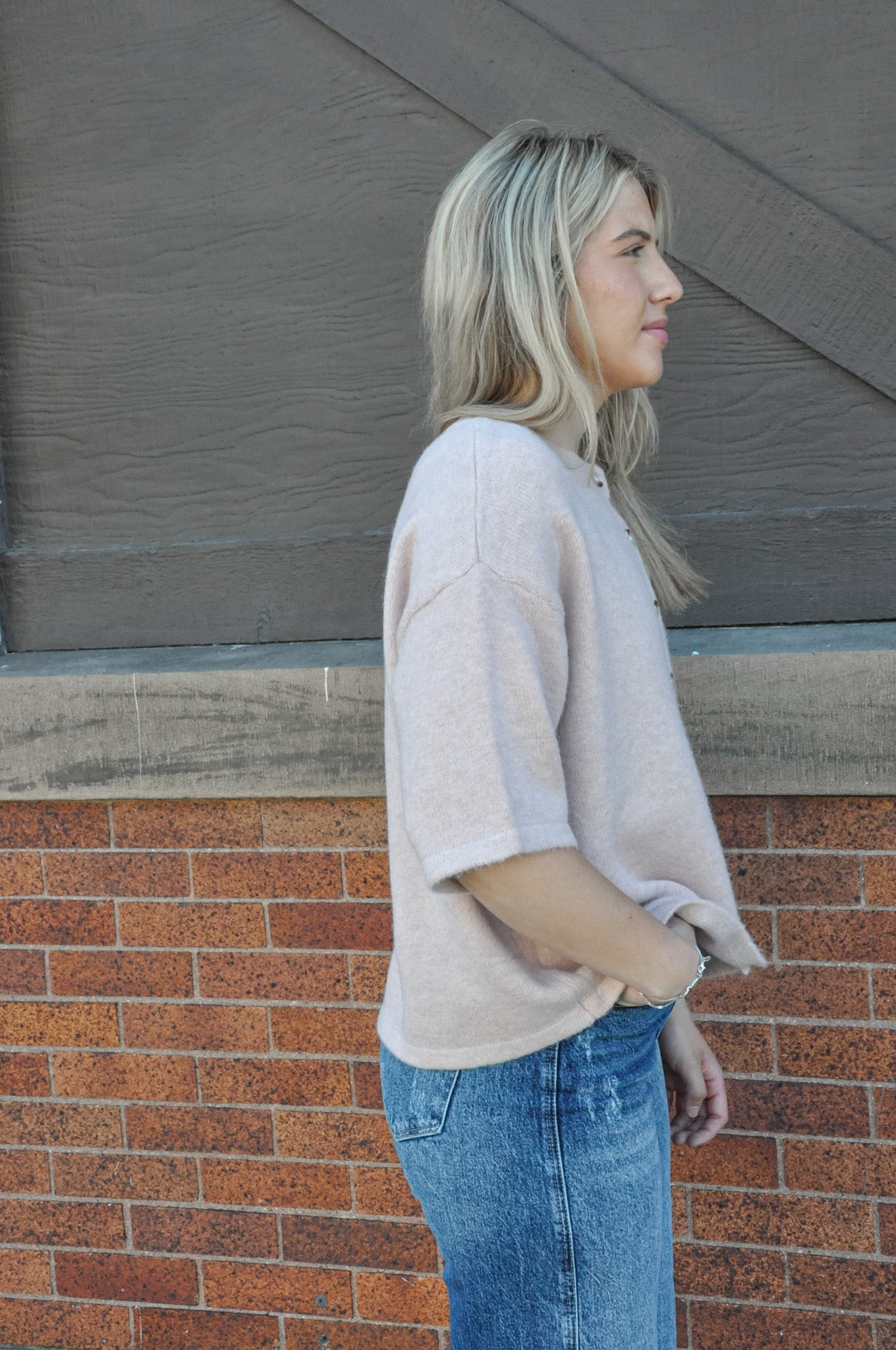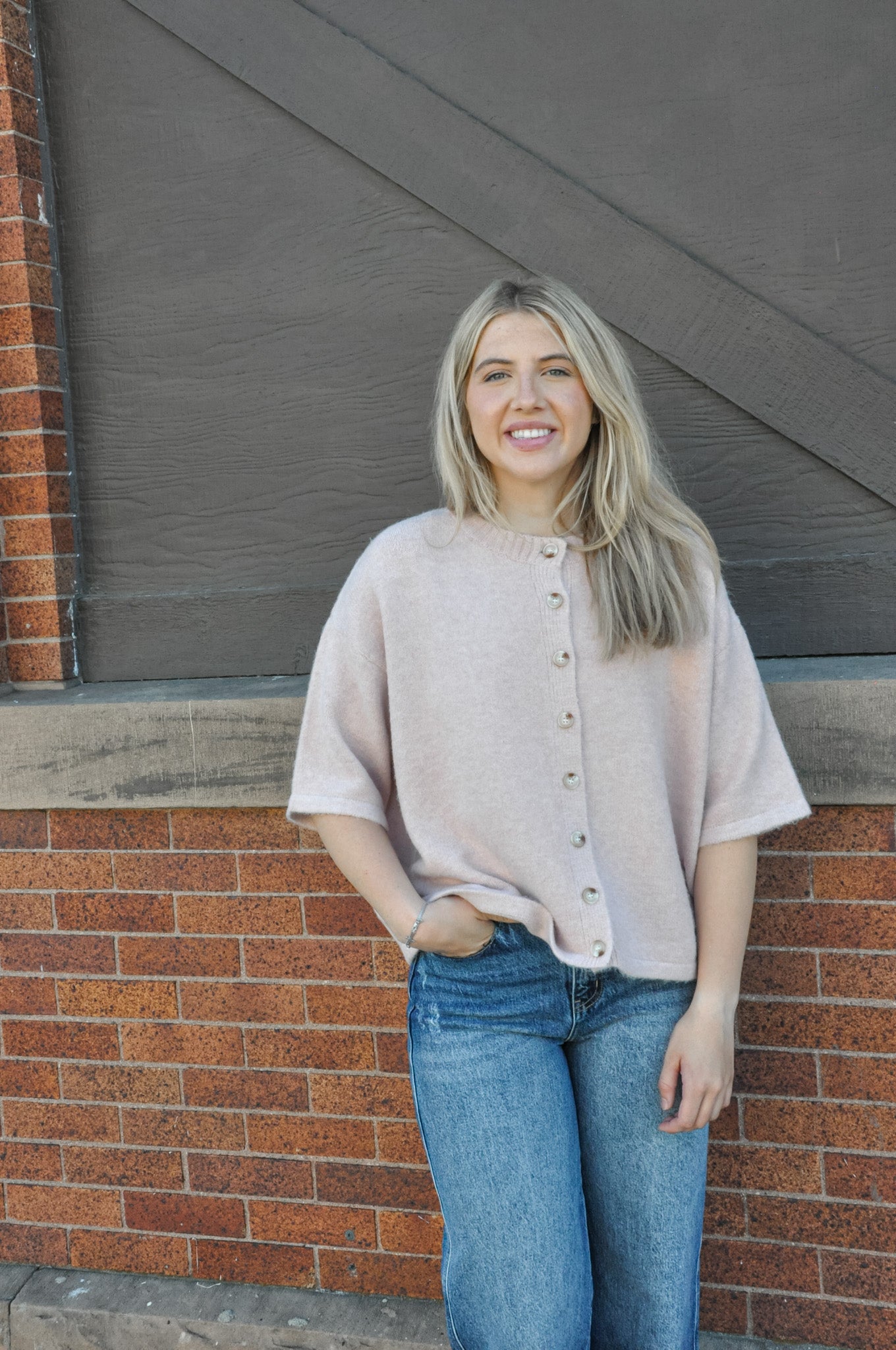 The Ballet Brushed Half Sleeve Button-Up Sweater is the perfect blend of cozy and chic. Crafted from a soft, brushed knit blend of 41% nylon, 33% polyester, and 26% acrylic, this sweater offers lightweight warmth with a dreamy, buttery-soft feel. Featuring functional buttons down the front and elegant half sleeves, it’s a versatile piece that can be worn buttoned up as a top or open as a layering essential. The relaxed yet refined fit makes it ideal for pairing with high-waisted jeans, skirts, or even over dresses for a feminine touch. Whether you’re dressing up for brunch or keeping it casual, this sweater brings effortless charm to your everyday wardrobe.