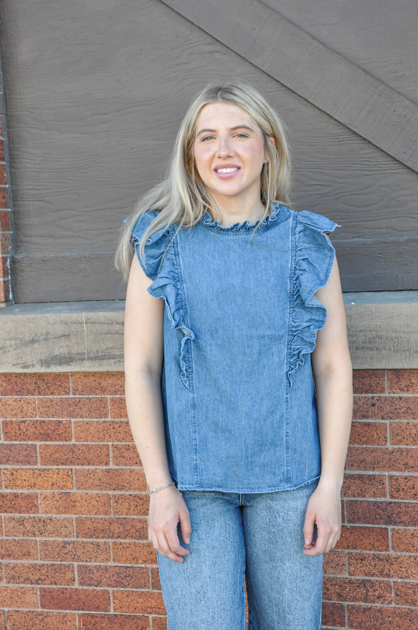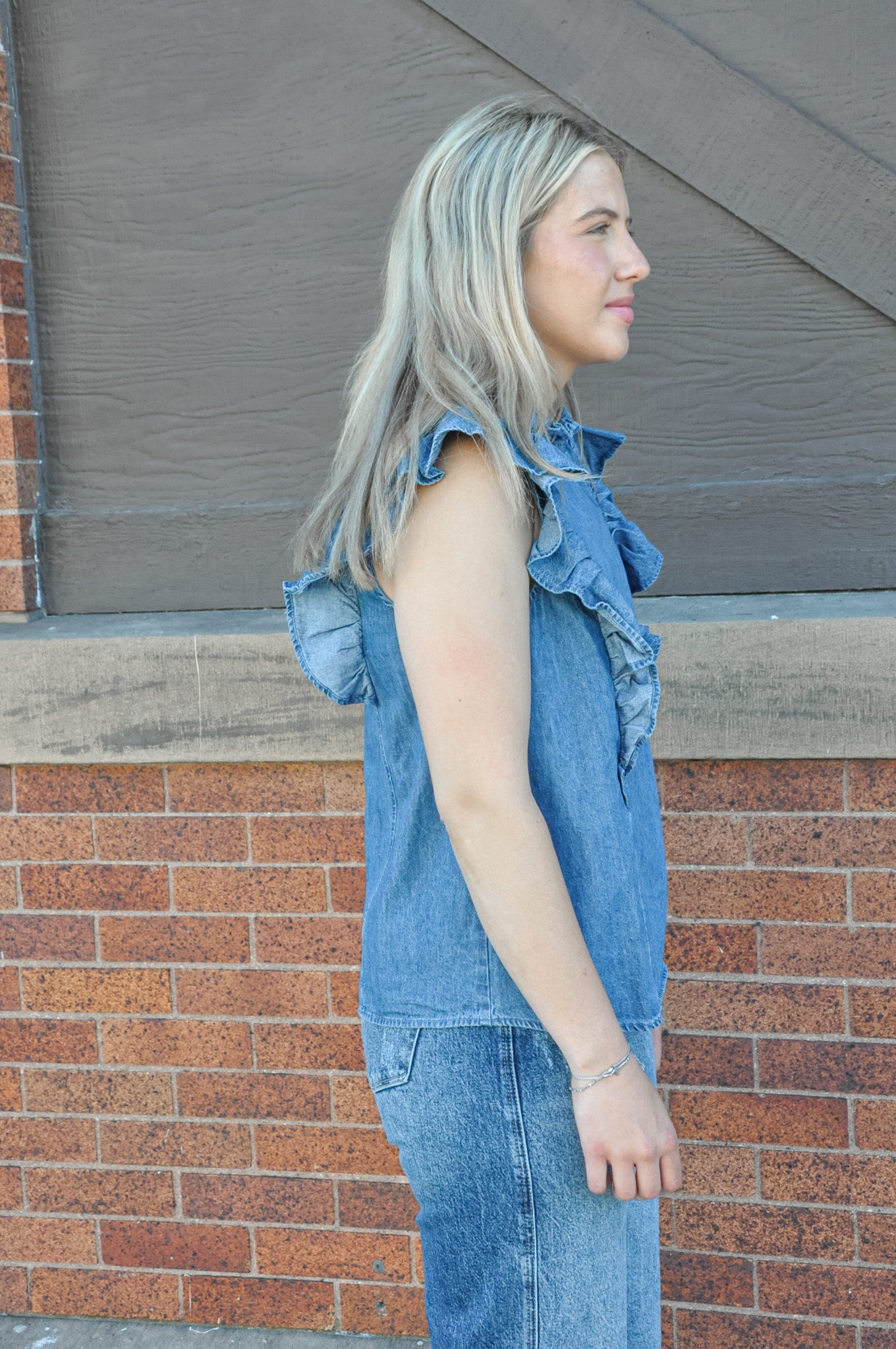 The Ruffle Trim Denim Top in Medium Denim is a playful and feminine twist on a classic favorite. Featuring delicate mock ruffle trim and charming cap sleeves, this top brings a whimsical elegance to your denim wardrobe. Soft ruffles accent the sleeves and front, adding just the right touch of flirtiness and movement. The medium wash denim gives it a timeless appeal, while the tailored fit keeps it polished and versatile. Perfect for pairing with skirts, shorts, or white jeans, this piece effortlessly transitions from day to night. Whether you're headed to brunch, a casual outing, or a summer festival, this denim top adds a dash of chic sophistication with a lighthearted flair.