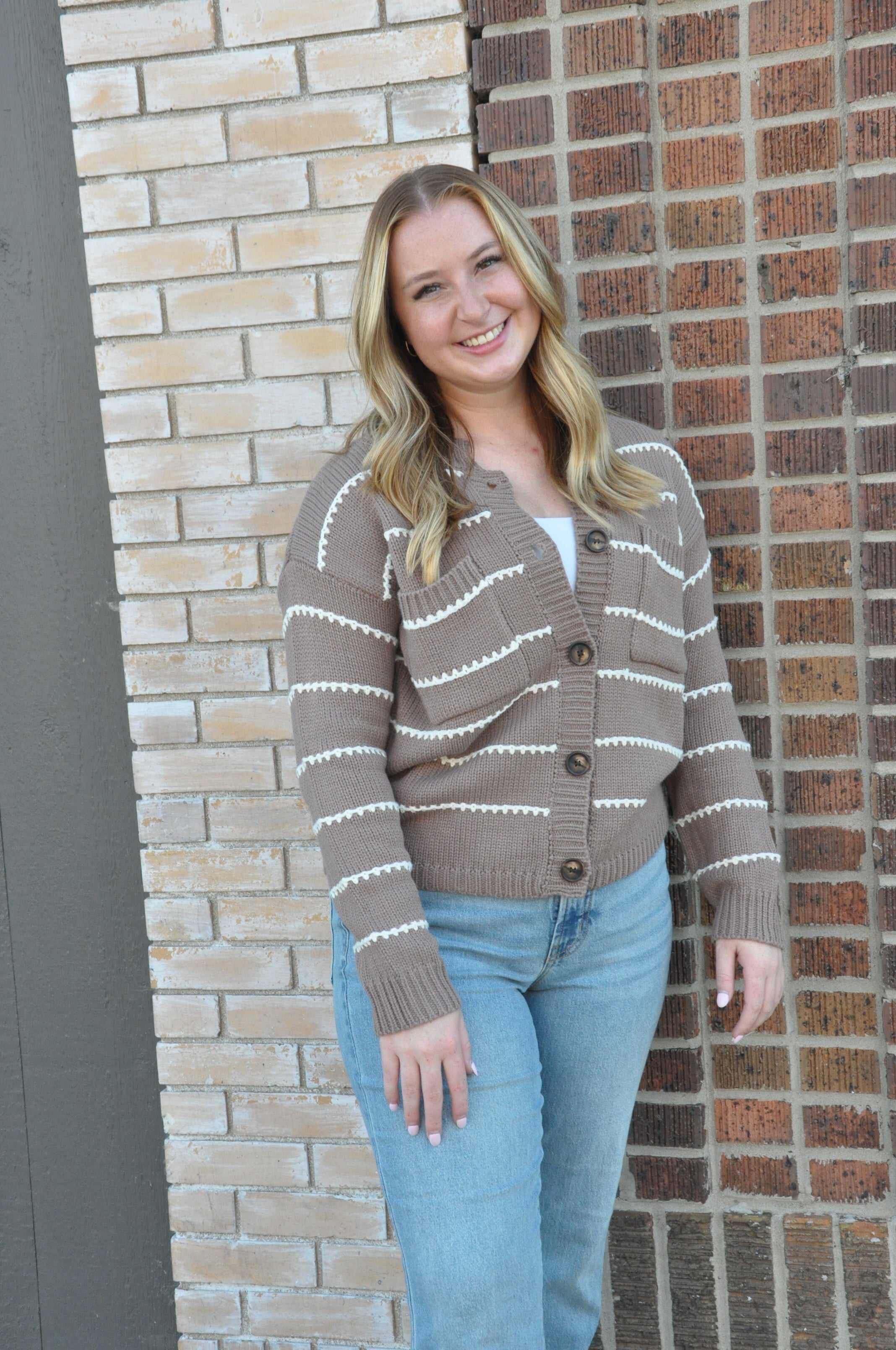 Stay warm while looking effortlessly put together with our High Neck Chest Pockets Sweater Jacket, available in cozy Cappuccino or classic Denim. Designed with a textured striped knit, this piece combines the comfort of a sweater with the structure of a jacket for the ultimate layering essential. The high neck adds extra warmth and a polished touch, while the button-down front gives you versatile styling options—wear it open over a tee for a relaxed vibe or buttoned up for a more refined look. Double chest pockets bring both functionality and a casual, outdoorsy charm, perfect for carrying small essentials on the go. Crafted from 100% acrylic, this sweater jacket offers softness, durability, and easy care, making it a go-to favorite for transitional weather. Pair it with jeans and boots for a laid-back weekend look or layer it over a dress for a cozy, chic outfit. It’s the perfect blend of style, comfort, and everyday practicality.