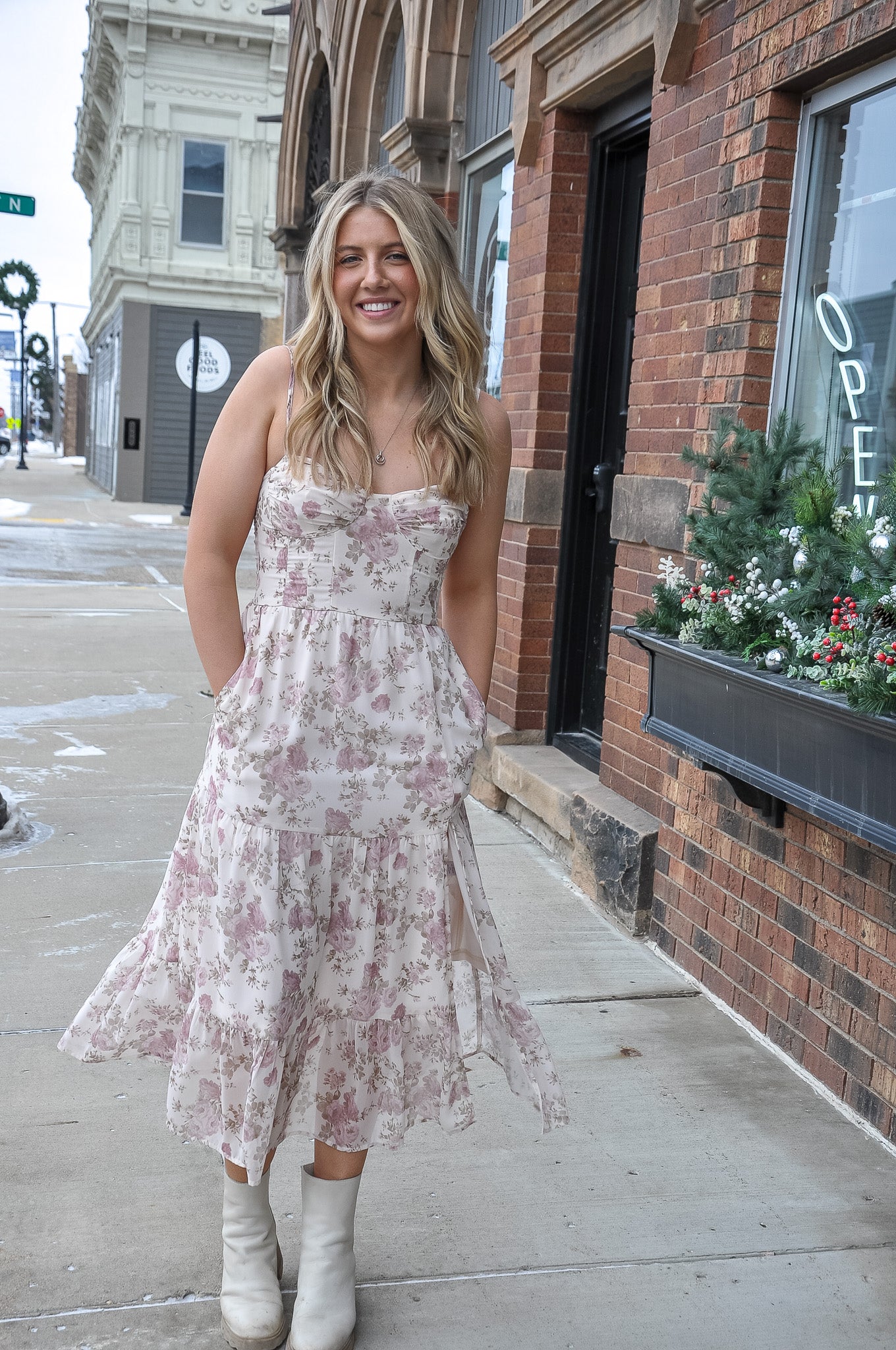 Romantic and effortlessly elegant, the Floral Print Corset Detail Maxi Dress is designed to make a statement. Featuring a soft cream multi floral print, this dress blends vintage-inspired charm with a modern, flattering silhouette. The structured bustier bodice and sweetheart neckline create beautiful shape and support, while delicate straps lead to an adjustable lace-up corset back for a customized fit. A flowing tiered skirt adds movement and femininity, complemented by a high side slit that brings just the right touch of allure. Crafted from lightweight polyester, it drapes gracefully and feels comfortable for all-day or evening wear. Perfect for date nights, garden parties, weddings, or elevated everyday styling, this dress pairs beautifully with sandals, heels, or a denim jacket. Thoughtfully designed with romantic details and easy wearability, it’s a standout piece that feels timeless yet on-trend—ideal for moments when you want to feel confident, feminine, and effortlessly put together.