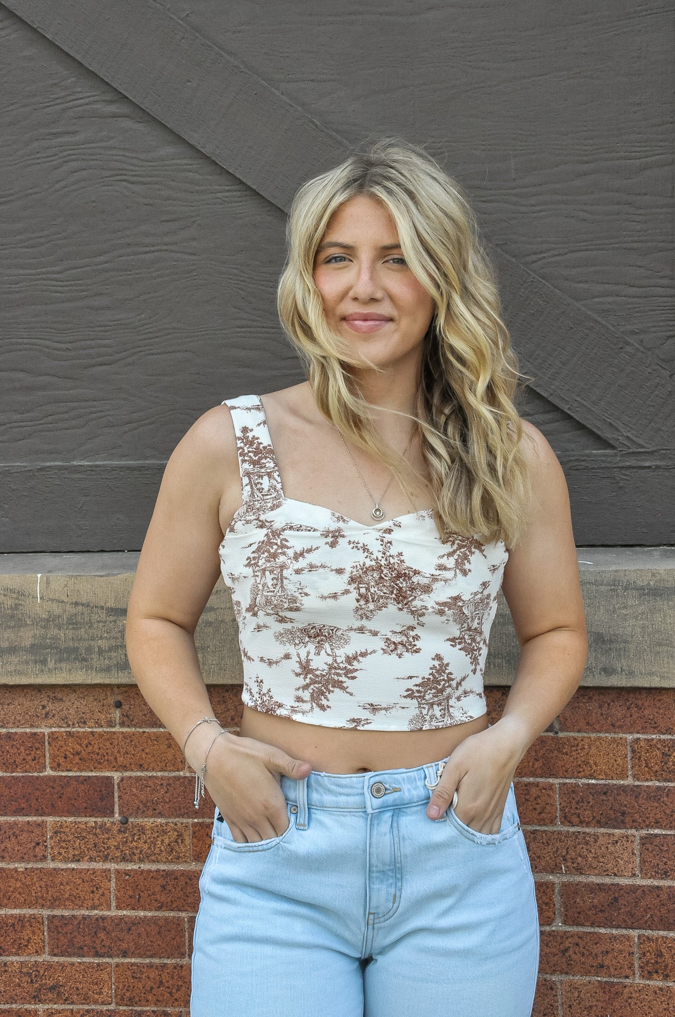 The Floral Sweetheart Sleeveless Crop Top in Brown is a romantic staple with a flattering, feminine vibe. Featuring a sweetheart neckline and sleeveless design, this woven crop top is adorned with a delicate floral pattern that brings charm to any outfit. The back smocking ensures a comfortable, flexible fit while adding subtle texture and shape. Made from a lightweight blend of 93% polyester and 7% spandex, it offers just the right amount of stretch without being lined. Perfect for pairing with high-waisted jeans, shorts, or skirts, this top transitions effortlessly from daytime outings to warm summer nights. Flirty, fun, and easy to wear—this one’s a must for your warm-weather wardrobe.