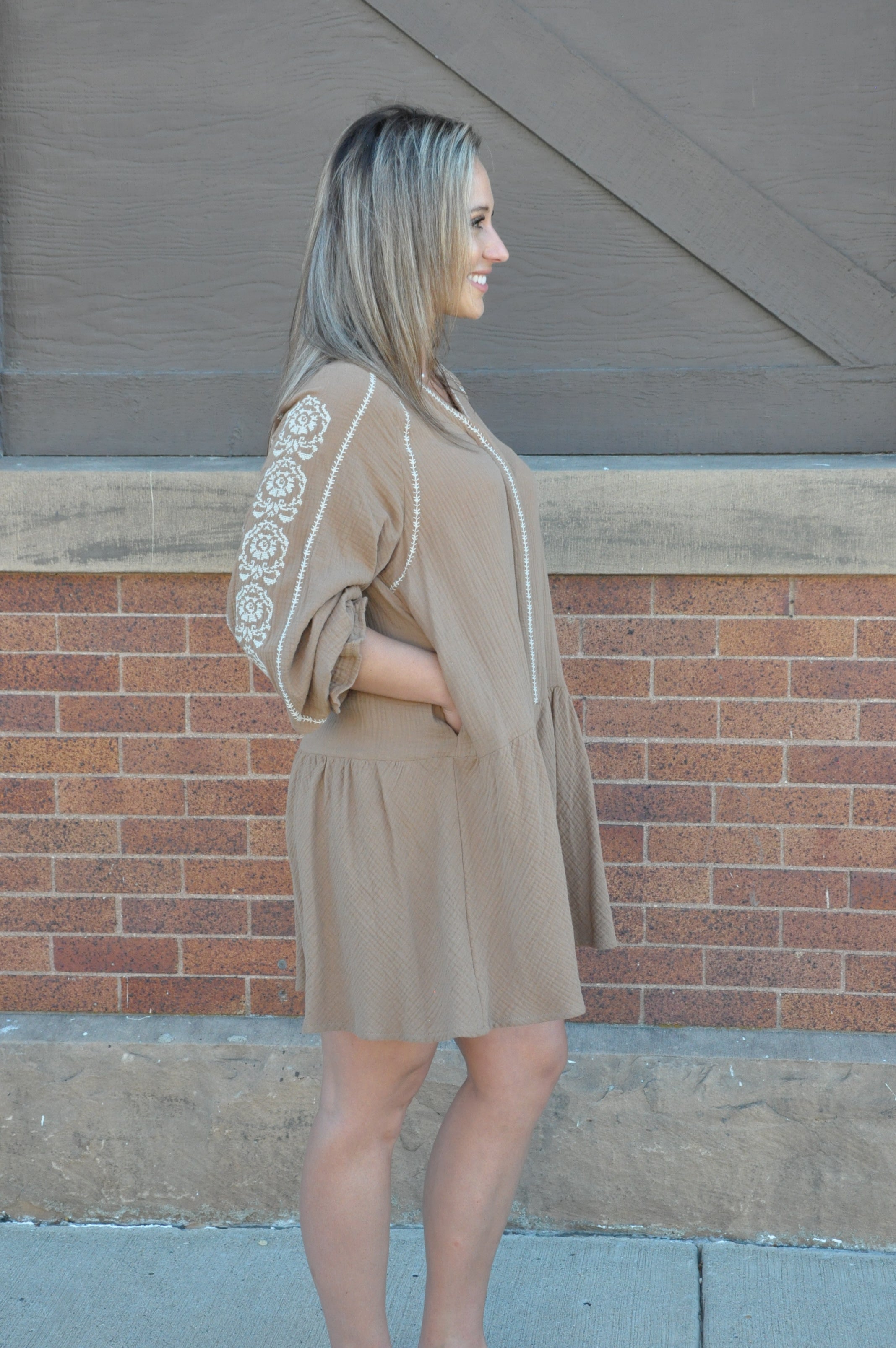 Designed with a loose and relaxed fit, this dress ensures all-day comfort, making it versatile for both casual and more dressed-up occasions. The added bonus of side pockets enhances its practicality without compromising style. Whether you're headed to brunch or a casual event, the Mocha Cotton Gauze Embroidered Dress is a go-to piece that combines laid-back elegance with subtle, eye-catching details.